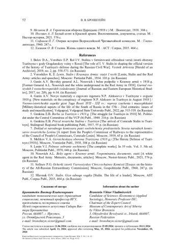 1. Белов Д. А., Воробьев Е. П. Роль И. В. Сталина в формировании официальной версии истории обороны Царицына в годы Гражданской войны в России // Вестник архивиста. 2019. № 2. С. 558-571. EDN: TSOAYJ