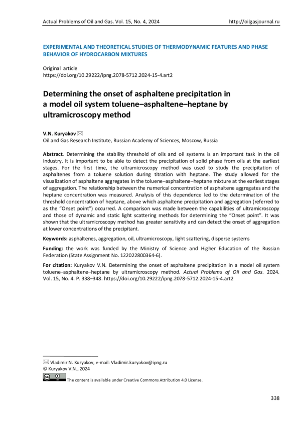 12. Kuryakov V.N. Study of asphaltene reaggregation in toluene/heptane mixture by dynamic and static light scattering // Petroleum Research. 2023. Vol. 9, No. 1. P. 48–54. https://doi.org/10.1016/j.ptlrs.2023.03.004