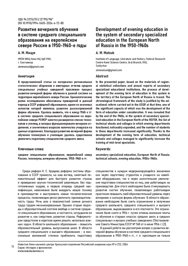 6. Мацук, А. М. Среднее специальное образование на Европейском Севере России в 1950-1980-е годы: историография и источники / А. М. Мацук; отв. ред. д.и.н., проф. А. А. Попов. - Сыктывкар: ИЯЛИ ФИЦ Коми НЦ УрО РАН, 2019. - 172 с.