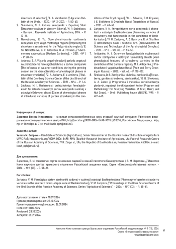 6. Зарипова, В. М. Перспективные сорта земляники и жимолости в условиях Башкортостана / В. М. Зарипова, А. З. Басырова, Р. А. Шафиков // Достижения науки и техники АПК. - 2019. - Т. 33, № 8. - С. 55-58. EDN: ZUFRWS