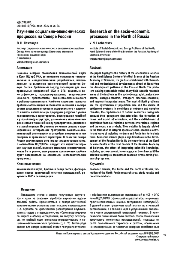 Подведение итогов и анализ полученных результатов – один из основных атрибутов научно-исследовательской работы. Применительно к северо-арктической тематике можно указать на опыт классика североведения Г. А. Аграната по критическому рассмотрению опубликованных трудов с утверждением, что «Сыктывкар лидирует по широте и объему исследований, по выпуску литературы, по крайней мере, экономико-географического и социально-экономического профиля» [1, с. 32].