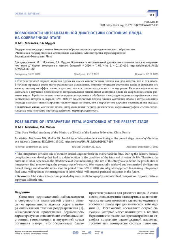 В течение процесса родов могут развиваться осложнения, которые ухудшают состояние плода и угрожают его жизни, поэтому от эффективности диагностики состояния плода зависит исход родов. Цель исследования заключалась в изучении возможностей интранатальной диагностики состояния плода на современном этапе развития науки. В работе систематически проанализированы и обобщены литературные данные зарубежных и отечественных авторов за период 1997–2020 гг. Комплексный подход оценки состояния плода в интранатальном периоде позволит оптимизировать тактику ведения родов, что в перспективе улучшит перинатальные исходы.