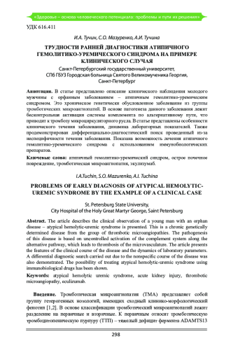 В статье представлено описание клинического наблюдения молодого мужчины с орфанным заболеванием - атипичным гемолитико-уремическим синдромом. Это хроническое генетически обусловленное заболевание из группы тромботических микроангиопатий. В основе патогенеза данного заболевания лежит бесконтрольная активация системы комплемента по альтернативному пути, что приводит к тромбозу микроциркуляторного русла. В статье представлены особенности клинического течения заболевания, динамика лабораторных показателей. Также продемонстрирован дифференциально-диагностический поиск проведенный из-за неспецифичности течения заболевания. Показана возможность лечения атипичного гемолитико-уремического синдрома с использованием иммунобиологических препаратов.