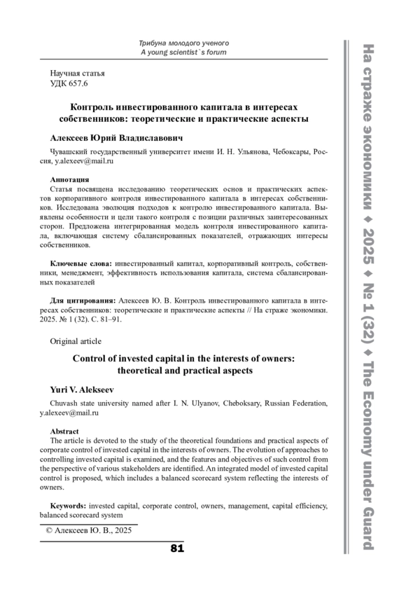 Статья посвящена исследованию теоретических основ и практических аспектов корпоративного контроля инвестированного капитала в интересах собственников. Исследована эволюция подходов к контролю инвестированного капитала. Выявлены особенности и цели такого контроля с позиции различных заинтересованных сторон. Предложена интегрированная модель контроля инвестированного капитала, включающая систему сбалансированных показателей, отражающих интересы собственников.