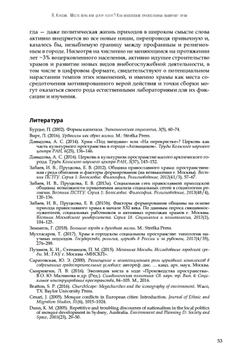 3. Давыдова, А. С. (2014). Храм «Под звездами» или «На перекрестке»? Церковь как часть культурного пространства в городе «Атомщиков». Труды Кольского научного центра РАН, 6(25), 136-146.