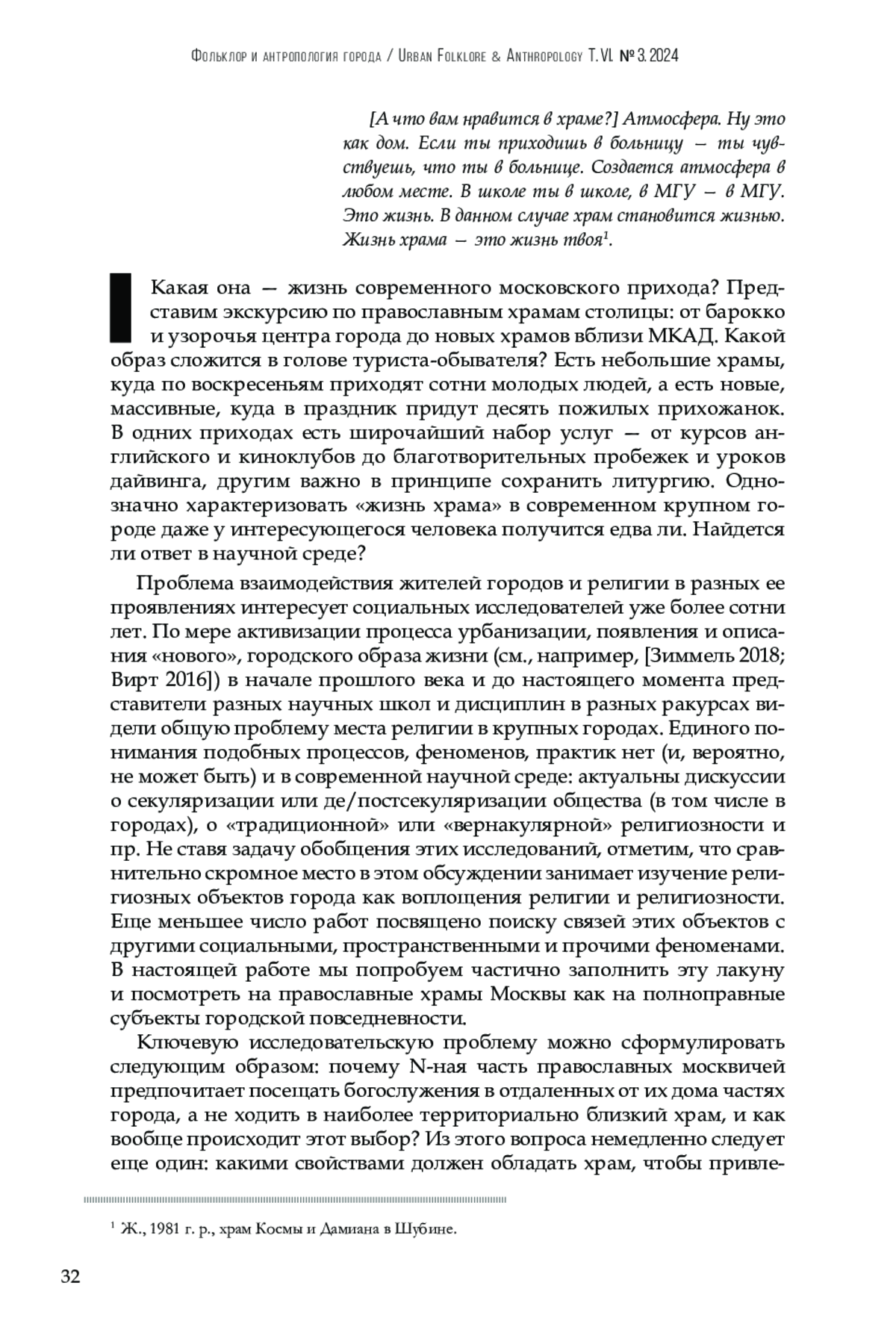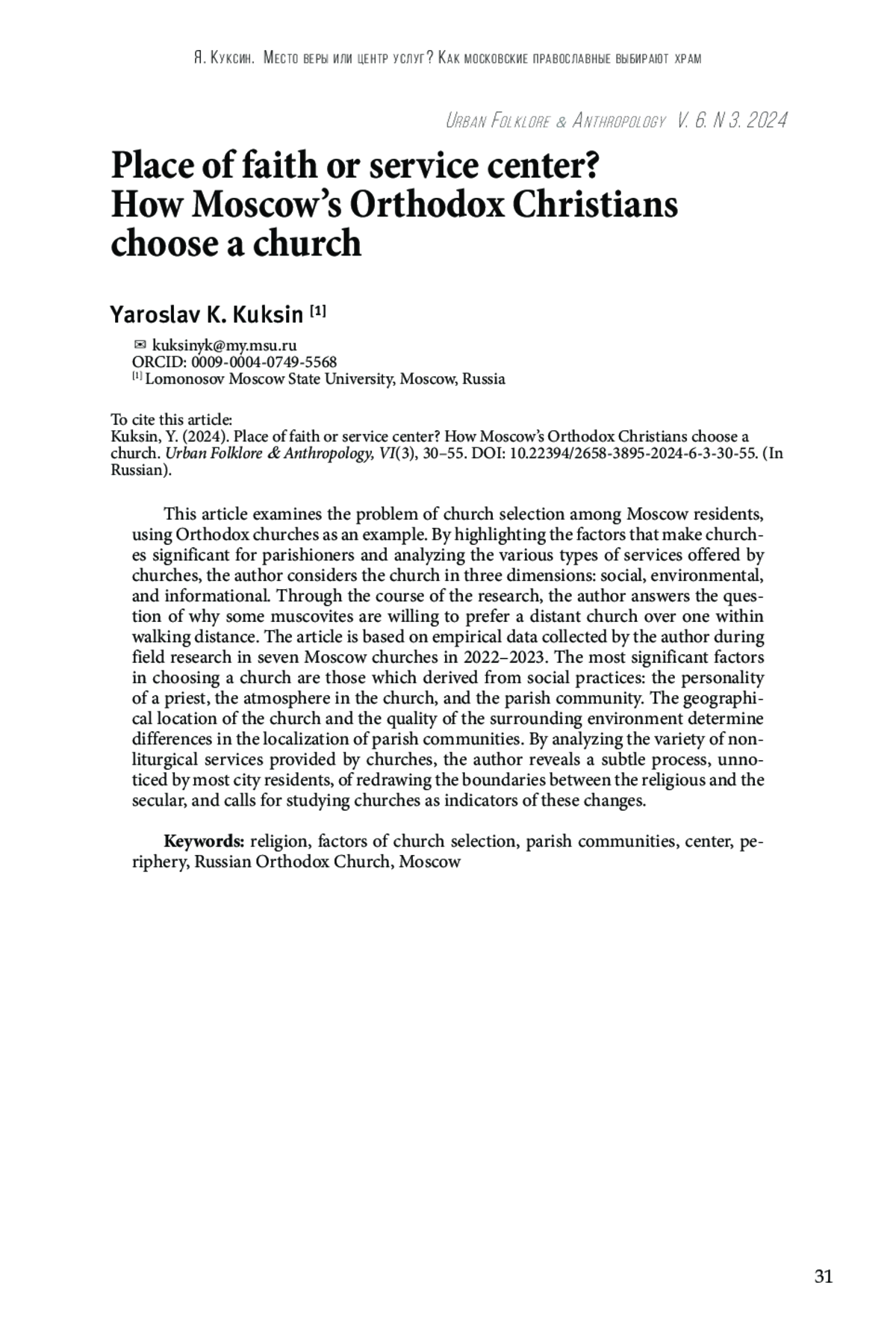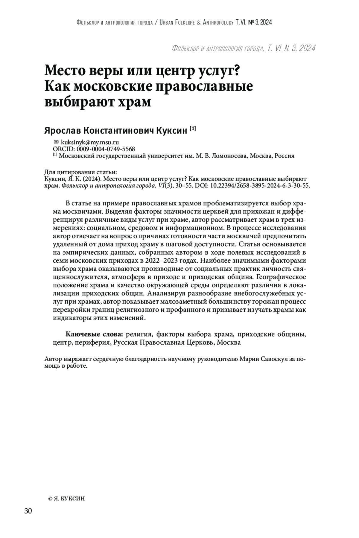 В статье на примере православных храмов проблематизируется выбор храма москвичами. Выделяя факторы значимости церквей для прихожан и дифференцируя различные виды услуг при храме, автор рассматривает храм в трех измерениях: социальном, средовом и информационном. В процессе исследования автор отвечает на вопрос о причинах готовности части москвичей предпочитать удаленный от дома приход храму в шаговой доступности. Статья основывается на эмпирических данных, собранных автором в ходе полевых исследований в семи московских приходах в 2022–2023 годах. Наиболее значимыми факторами выбора храма оказываются производные от социальных практик личность священнослужителя, атмосфера в приходе и приходская община. Географическое положение храма и качество окружающей среды определяют различия в локализации приходских общин. Анализируя разнообразие внебогослужебных услуг при храмах, автор показывает малозаметный большинству горожан процесс перекройки границ религиозного и профанного и призывает изучать храмы как индикаторы этих изменений.