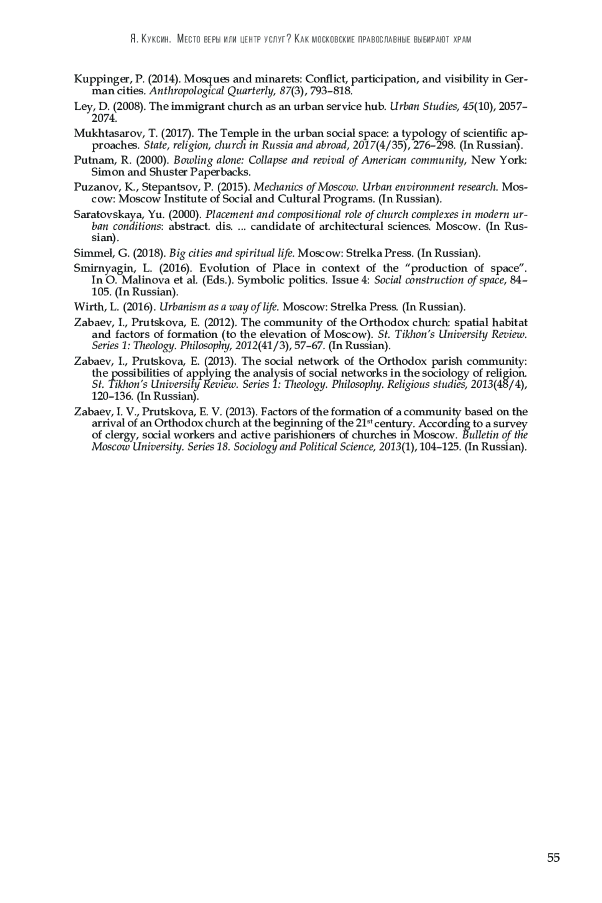 7. Забаев, И. В., Пруцкова, Е. В. (2013b). Факторы формирования общины на основе прихода православного храма в начале ХХI века. По данным опроса священнослужителей, социальных работников и активных прихожан храмов г. Москвы. Вестник Московского университета. Серия 18. Социология и политология, 2013(1), 104-125.
