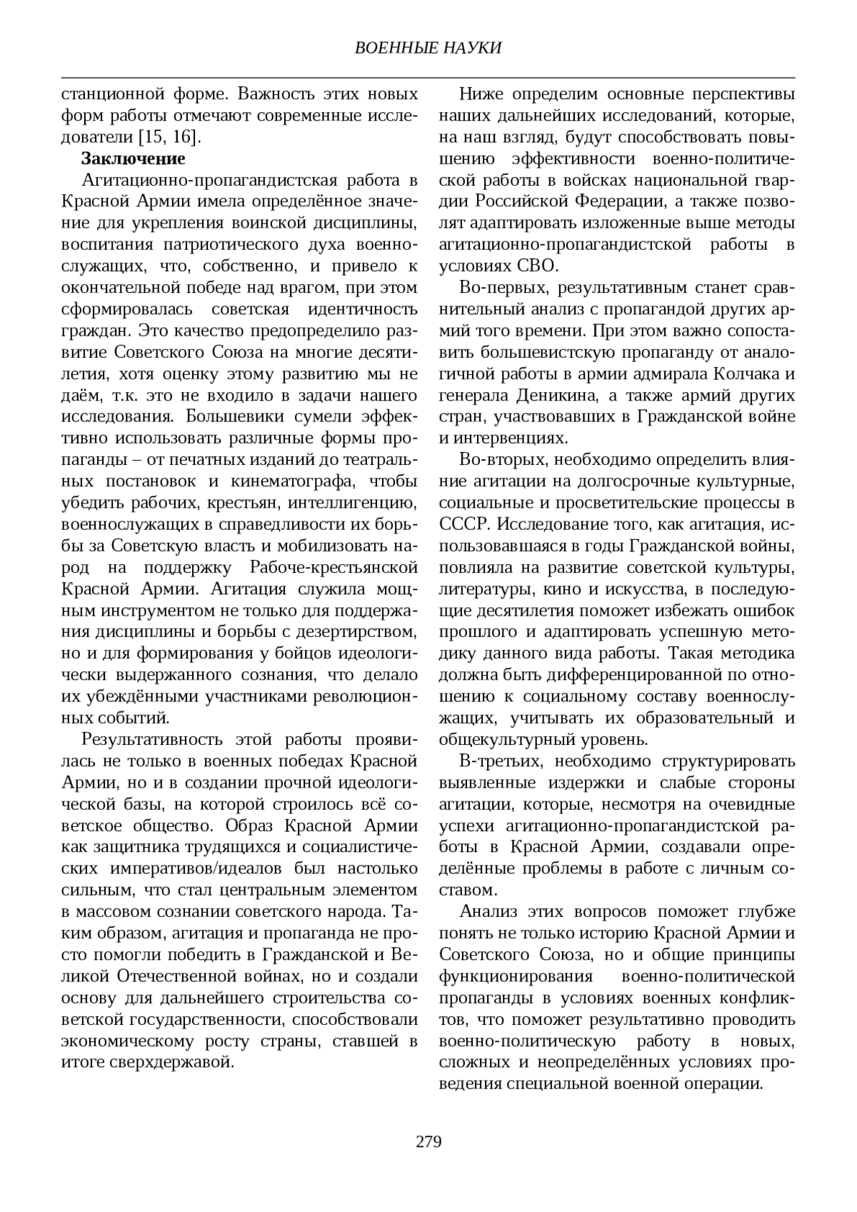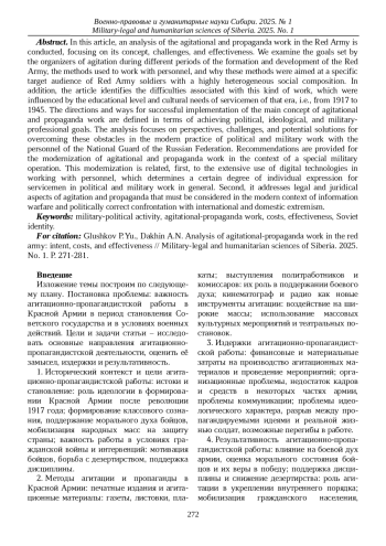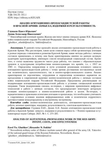 В данной статье проведён анализ агитационно-пропагандистской работы в Красной Армии. Мы рассмотрим, какие цели ставили перед собой организаторы агитации в разные периоды становления и развития Красной Армии, какие методы работы с личным составом применялись и почему они были ориентированы именно на данную целевую аудиторию красноармейцев, имеющую совсем неоднородный социальный состав. Кроме того, в статье выявлены трудности такого рода работы, что связано с образовательным уровнем и культурными потребностями военнослужащих тех времён, т. е. с 1917 по 1945 гг. Определены направления и пути успешной реализации основного замысла агитационно-пропагандистской работы с точки зрения достижения поставленных целей как политического, идеологического, так и военно-профессионального планов. Анализ ориентирован на перспективы, затруднения и определения возможных вариантов их преодоления в современной практике военно-политической работы с личным составом войск национальной гвардии Российской Федерации. Предложены рекомендации по модернизации агитационно-пропагандистской работы в условиях специальной военной операции. Такая модернизация связана, во-первых, с широким применением цифровых технологий в работе с личным составом, что предопределяет некоторую авторскую позицию военнослужащего в военно-политической работе в целом. Во-вторых, с юридическими и правовыми аспектами агитации и пропаганды, что необходимо учитывать в современных условиях ведения информационных войн и политически корректного противостояния международному и внутреннему экстремизму.