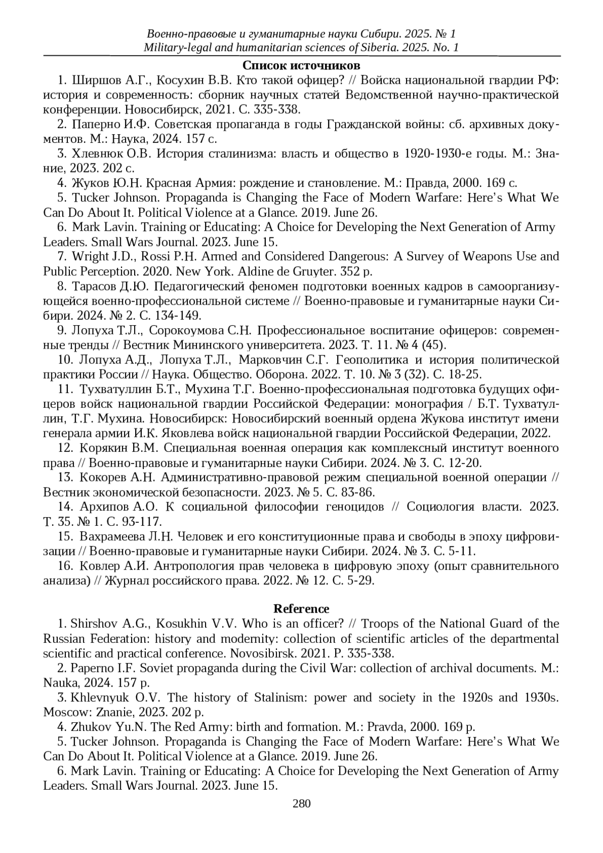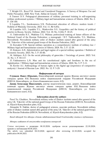 8. Тарасов Д.Ю. Педагогический феномен подготовки военных кадров в самоорганизующейся военно-профессиональной системе // Военно-правовые и гуманитарные науки Сибири. 2024. № 2. С. 134-149. EDN: MPLFCM