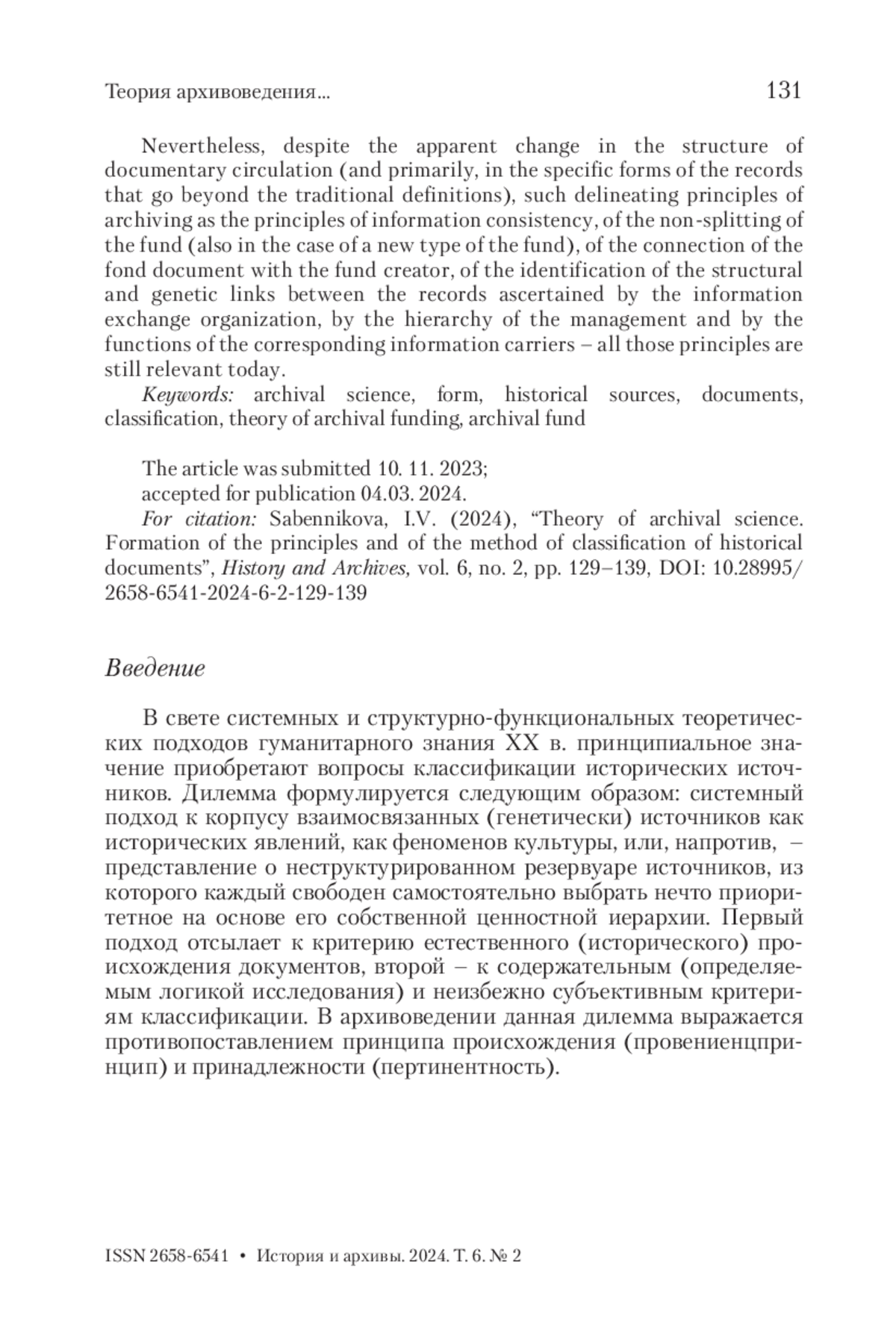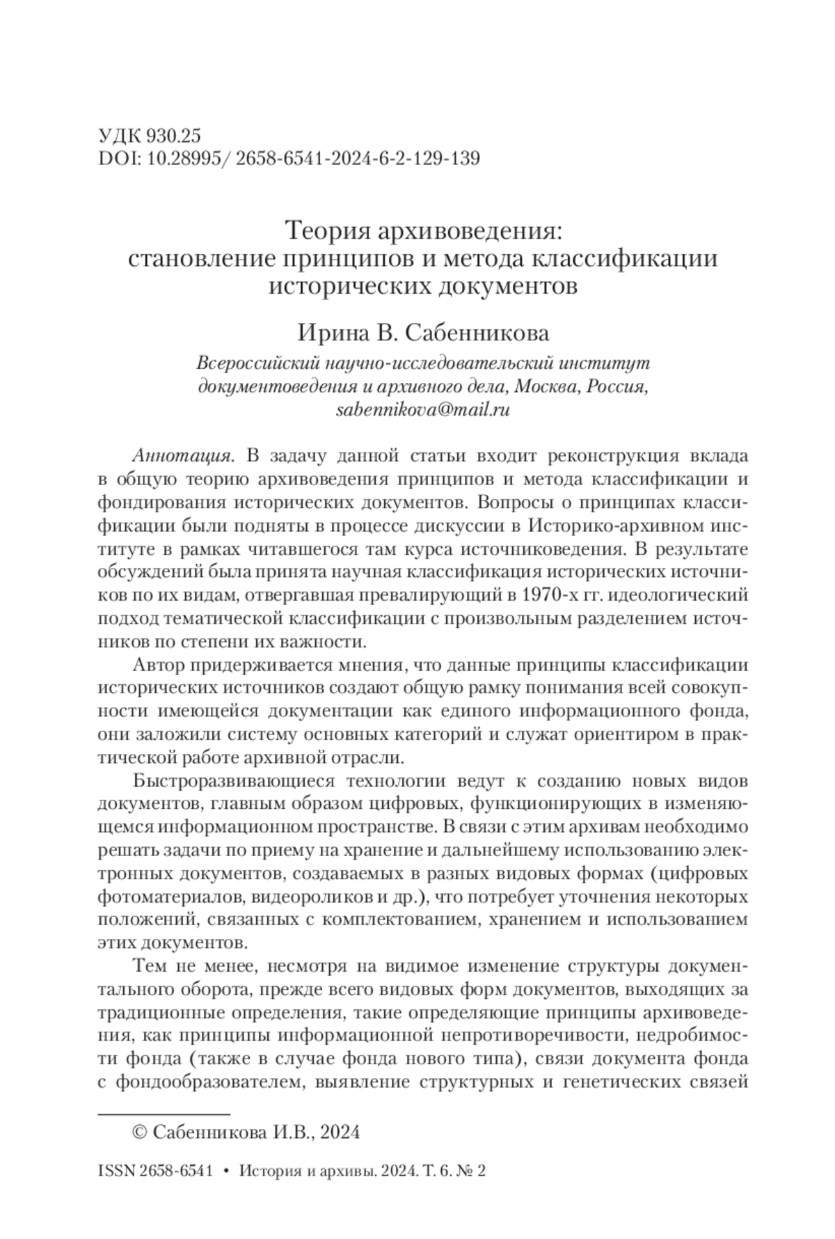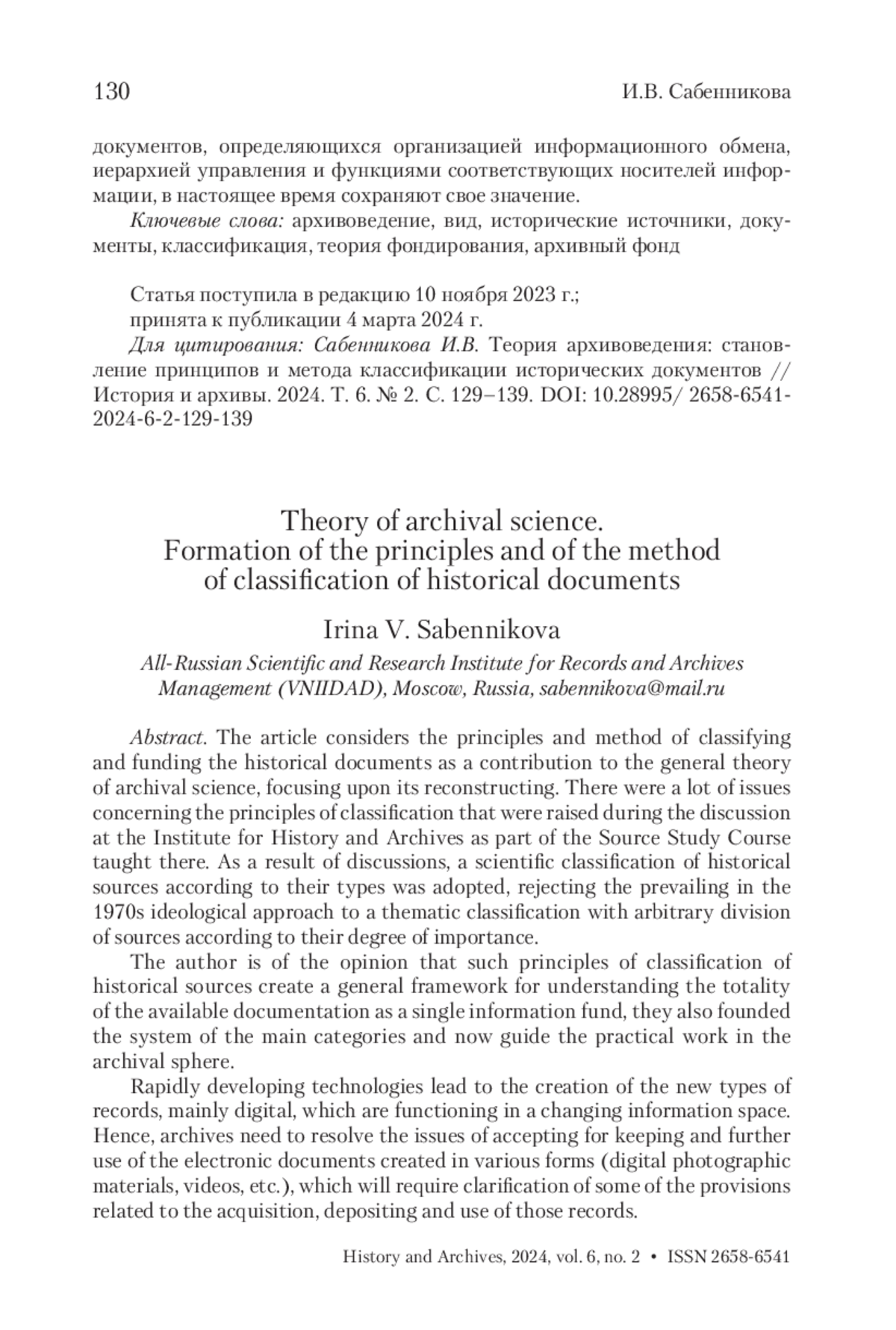 В задачу данной статьи входит реконструкция вклада в общую теорию архивоведения принципов и метода классификации и фондирования исторических документов. Вопросы о принципах классификации были подняты в процессе дискуссии в Историко-архивном институте в рамках читавшегося там курса источниковедения. В результате обсуждений была принята научная классификация исторических источников по их видам, отвергавшая превалирующий в 1970-х гг. идеологический подход тематической классификации с произвольным разделением источников по степени их важности.