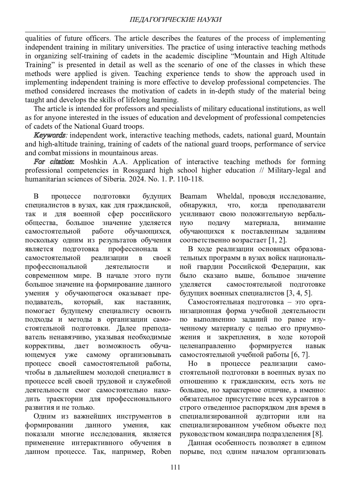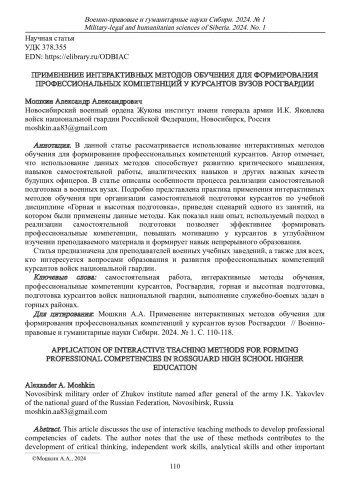 Статья предназначена для преподавателей военных учебных заведений, а также для всех, кто интересуется вопросами образования и развития профессиональных компетенций курсантов войск национальной гвардии.
