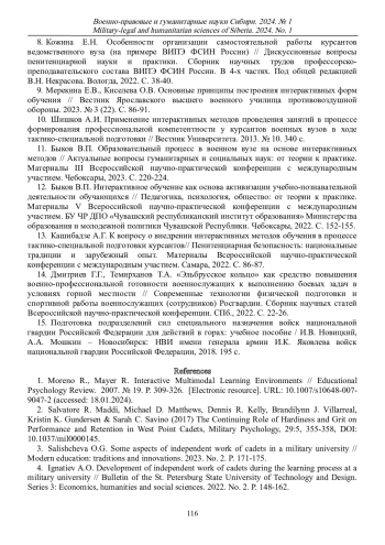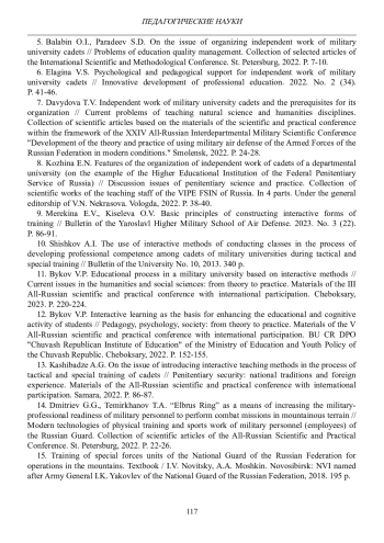 6. Елагина В.С. Психолого-педагогическое сопровождение самостоятельной работы курсантов военного вуза // Инновационное развитие профессионального образования. 2022. № 2 (34). С. 41-46. EDN: TKYULA