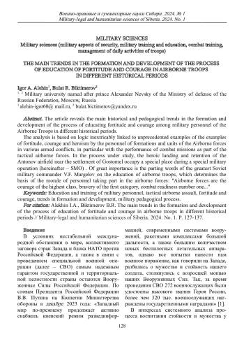 В статье раскрываются основные историко-педагогические тенденции становления и развития процесса воспитания стойкости и мужества у военнослужащих Воздушно-десантных войск (далее - ВДВ) в различные исторические периоды.