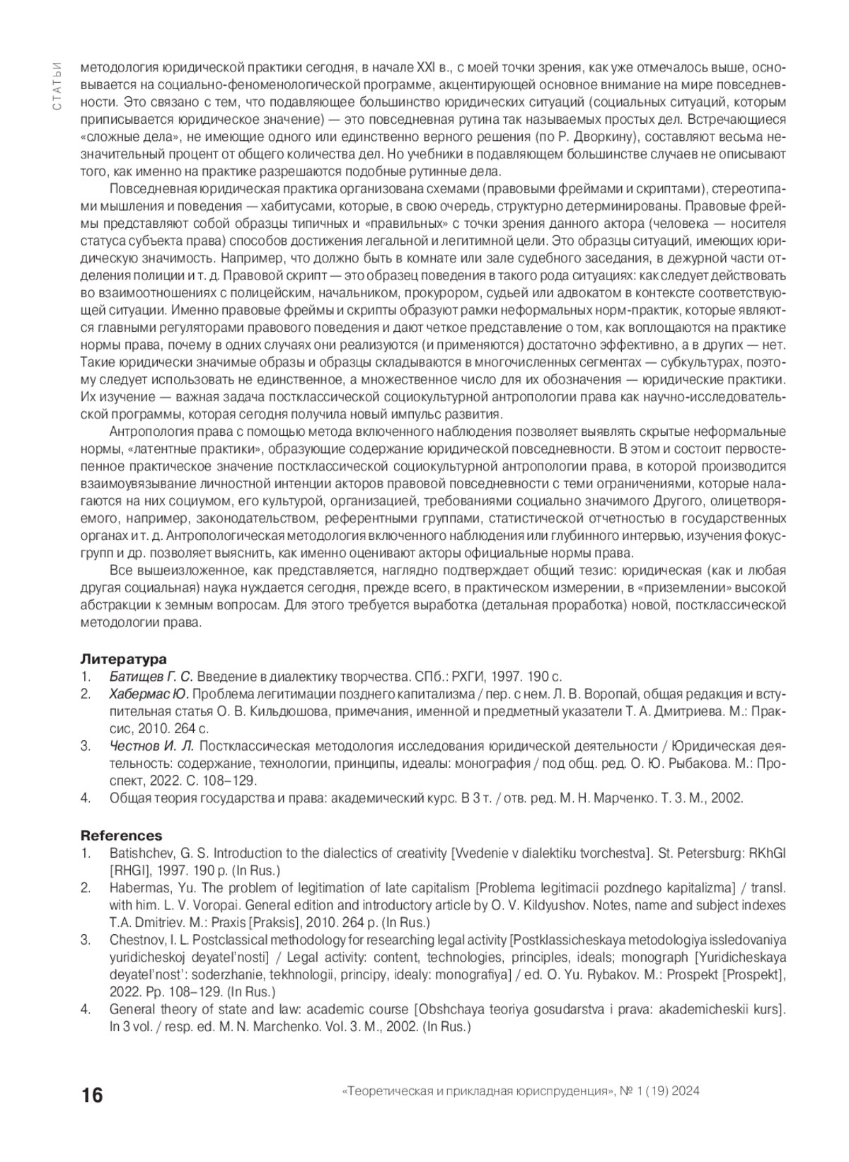 3. Честнов И. Л . Постклассическая методология исследования юридической деятельности / Юридическая деятельность: содержание, технологии, принципы, идеалы: монография / под общ. ред. О. Ю. Рыбакова. М.: Проспект, 2022. С. 108-129.