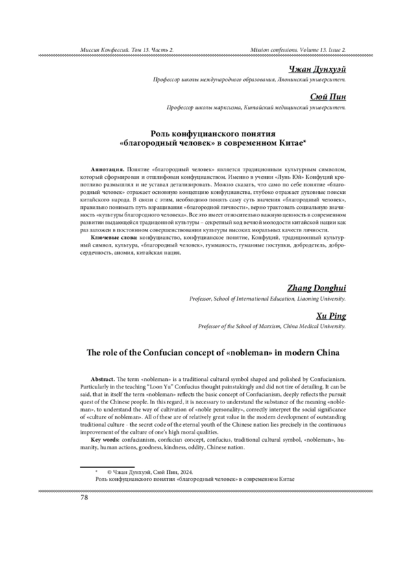 Понятие «благородный человек» является традиционным культурным символом, который сформирован и отшлифован конфуцианством. Именно в учении «Лунь Юй» Конфуций кропотливо размышлял и не уставал детализировать. Можно сказать, что само по себе понятие «благородный человек» отражает основную концепцию конфуцианства, глубоко отражает духовные поиски китайского народа. В связи с этим, необходимо понять саму суть значения «благородный человек», правильно понимать путь взращивания «благородной личности», верно трактовать социальную значимость «культуры благородного человека». Все это имеет относительно важную ценность в современном развитии выдающейся традицонной культуры - секретный код вечной молодости китайской нации как раз заложен в постоянном совершенствовании культуры высоких моральных качеств личности.
