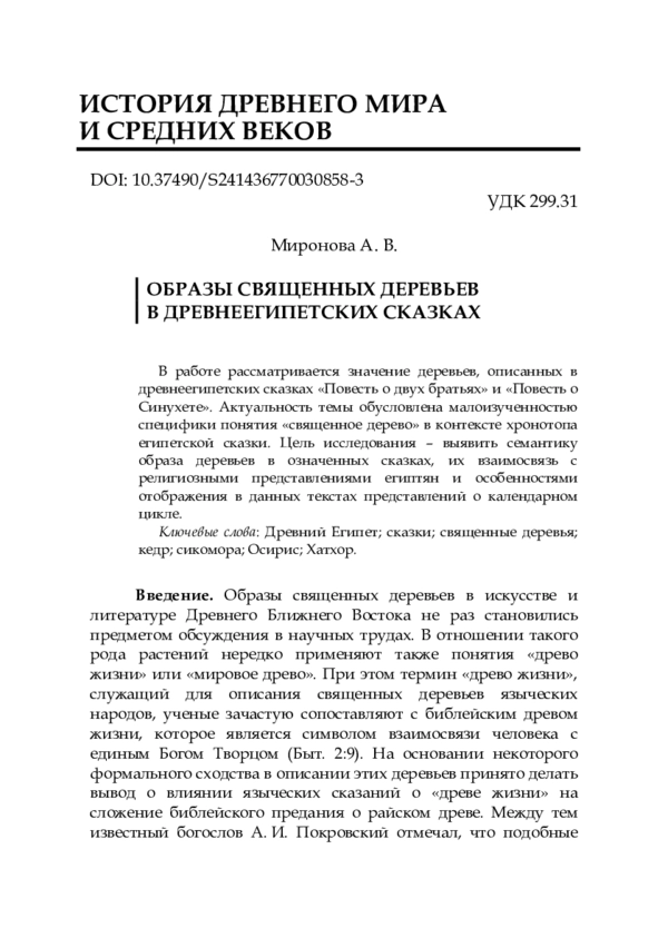 В работе рассматривается значение деревьев, описанных в древнеегипетских сказках «Повесть о двух братьях» и «Повесть о Синухете». Актуальность темы обусловлена малоизученностью специфики понятия «священное дерево» в контексте хронотопа египетской сказки. Цель исследования - выявить семантику образа деревьев в означенных сказках, их взаимосвязь с религиозными представлениями египтян и особенностями отображения в данных текстах представлений о календарном цикле