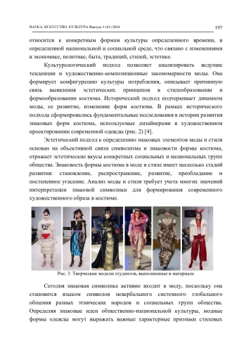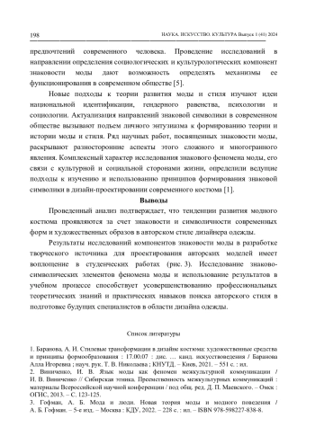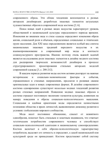 Специфика дизайна костюма заключается в воплощении визуальной формы художественного образа через индивидуальность представителей разных социальных и этнических групп населения. Органическое сочетание дизайна костюма с окружающей предметно-пространственной средой, материальными объектами культуры, национальными традициями, социально-культурными нормами и обычаями являются стилевыми признаками не только культуры, но и современных проявлений общественных отношений, ориентированных на проектирование целостного современного образа. Эти общие тенденции воплощаются в разных авторских дизайнерских разработках знаковых элементов актуальных художественных образов в современной моде костюма [2; 6].
