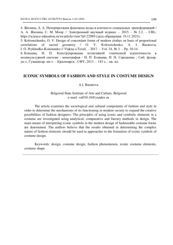 1. Баранова, А. И. Стилевые трансформации в дизайне костюма: художественные средства и принципы формообразования: 17.00.07: дис. … канд. искусствоведения / Баранова Алла Игоревна; науч. рук. Т. В. Николаева; КНУТД. - Киев, 2021. - 551 с.