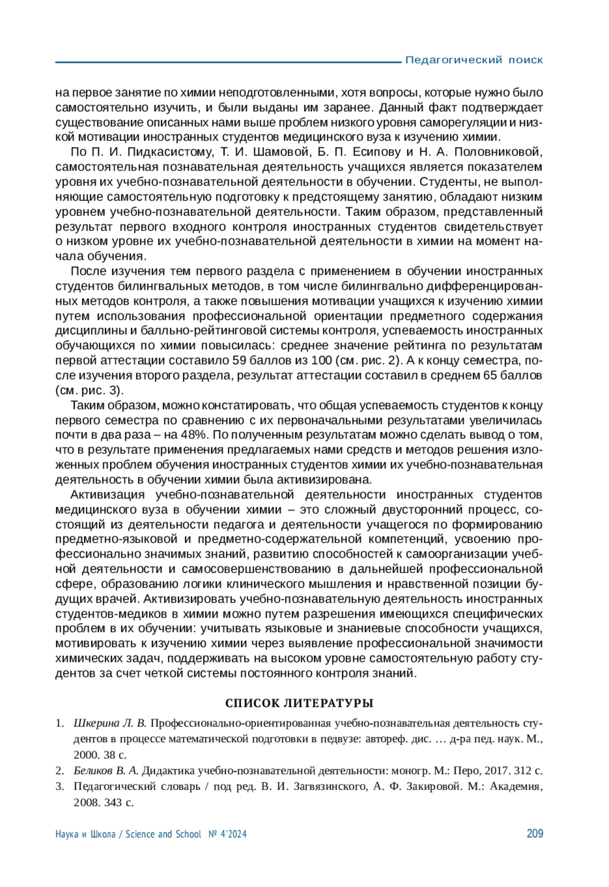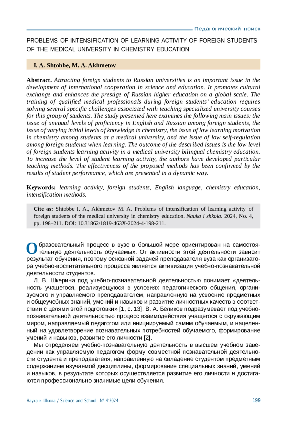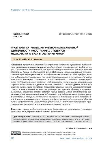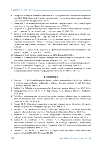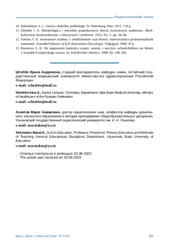 11. Штоббе И. А. Методология и методика преподавания химии иностранным студентам // Межкультурная коммуникация в образовании и медицине. 2021. № 1. С. 38–46.