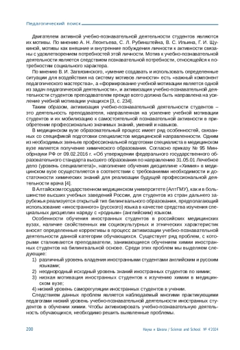 Привлечение иностранных студентов к обучению в российских вузах является актуальным вопросом развития международного сотрудничества в области науки и образования, способствует культурному обмену и повышает престиж высшего образования России на общемировой арене. Подготовка квалифицированных специалистов медицинской направленности при обучении иностранных граждан требует решения ряда специфических проблем, сопутствующих преподаванию специальных дисциплин вуза данной категории обучающихся. В представленном исследовании рассматриваются следующие основные проблемы: неоднородность уровня владения иностранными студентами английским и русским языками, различный исходный уровень знаний учащихся по химии, низкая мотивация студентов к изучению химии в медицинском университете и недостаточный уровень саморегуляции иностранных обучающихся в учении. Следствием описанных проблем является низкий уровень учебно-познавательной деятельности иностранных студентов медицинского вуза в билингвальном обучении химии. В исследовании авторами предлагаются методы для активизации учебно-познавательной деятельности иностранных студентов медицинского вуза в билингвальном обучении химии. Эффективность использования предложенных методов подтверждается представленными в динамике результатами успеваемости учащихся.