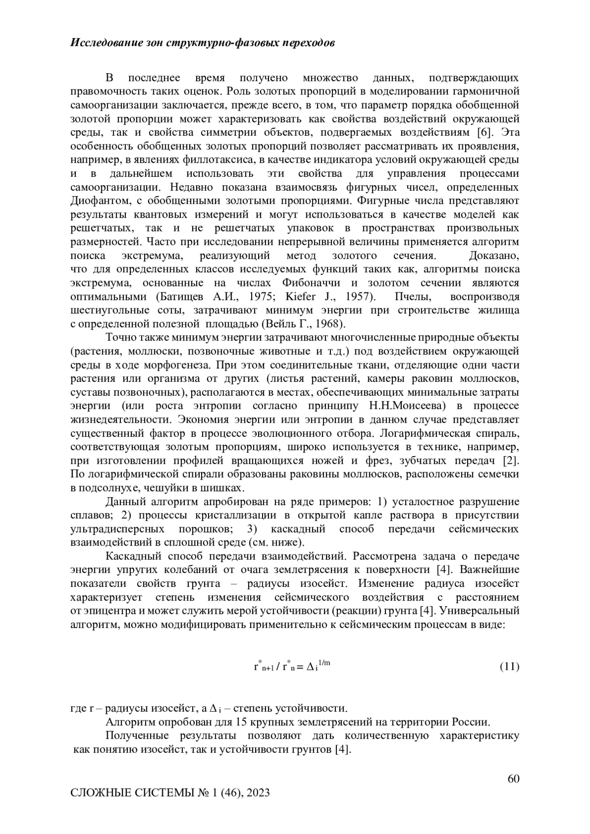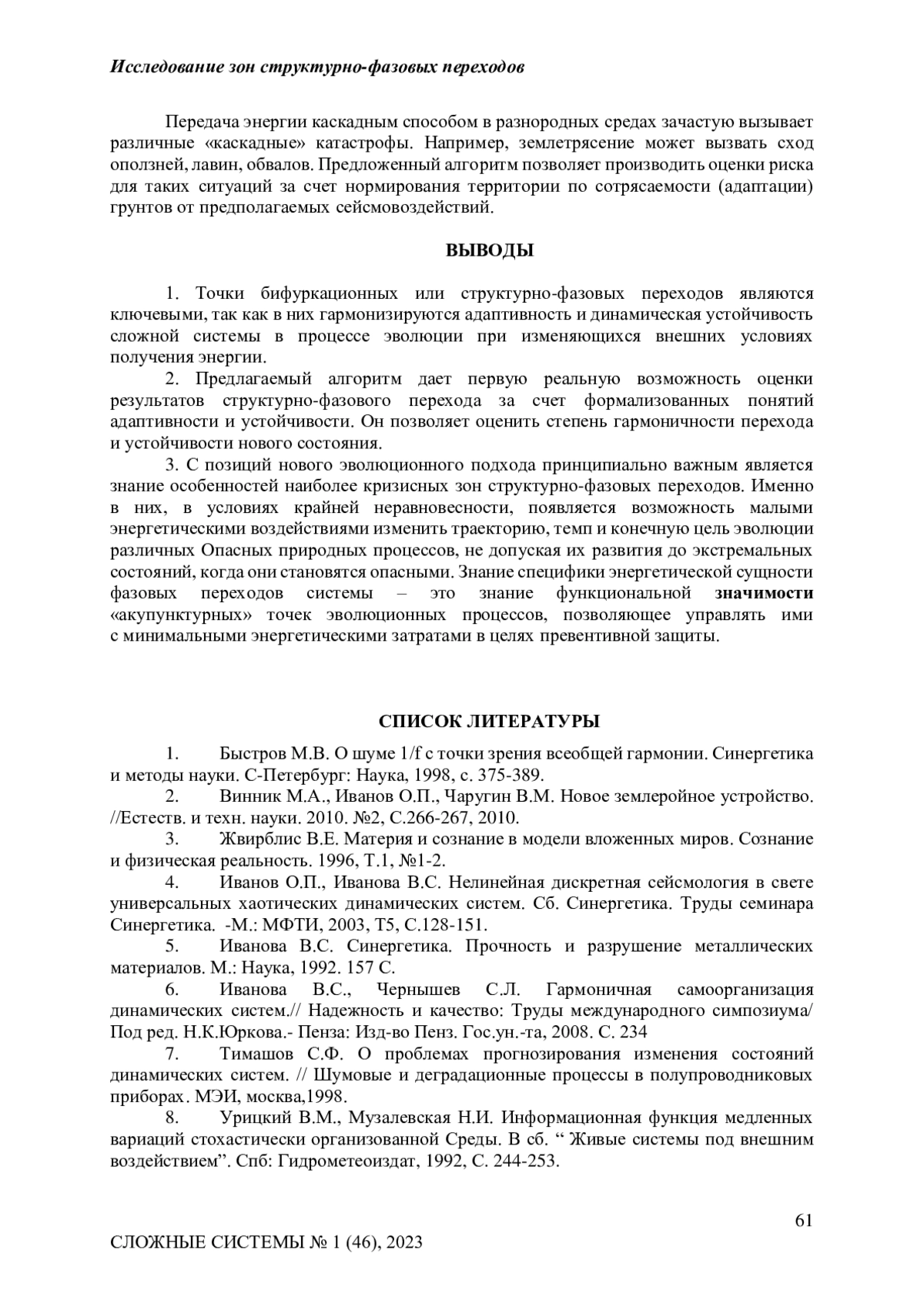 Проведен анализ роли бифуркационных или структурно-фазовых переходов в эволюции сложных систем с помощью феноменологического алгоритма и формализованных понятий адаптивности и устойчивости. Показано, что алгоритм позволяет оценить степень гармоничности перехода и устойчивости нового состояния. Знание особенностей наиболее кризисных зон структурно-фазовых переходов дают возможность малыми энергетическими воздействиями изменить траекторию, темп и конечную цель эволюции различных опасных природных процессов, не допуская их развития до экстремальных состояний. Знание функциональной значимости таких «акупунктурных» точек эволюционных процессов, позволяет управлять ими с минимальными энергетическими затратами в целях превентивной защиты.