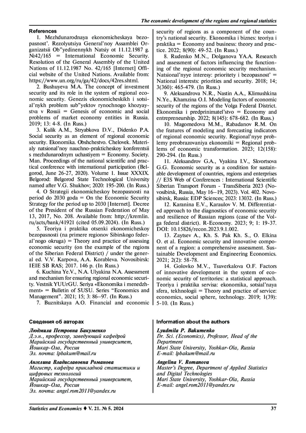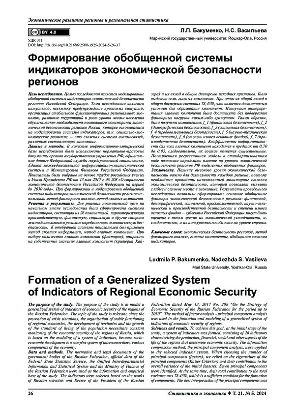 БАКУМЕНКО Л. П., ВАСИЛЬЕВА Н. С. ФОРМИРОВАНИЕ ОБОБЩЕННОЙ СИСТЕМЫ ИНДИКАТОРОВ ЭКОНОМИЧЕСКОЙ БЕЗОПАСНОСТИ РЕГИОНОВ // СТАТИСТИКА И ЭКОНОМИКА. 2024. Т. 21 № 5
