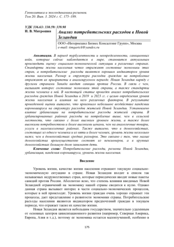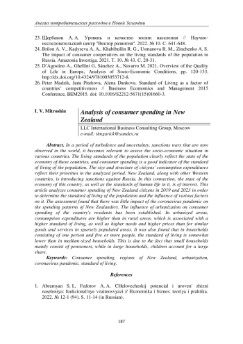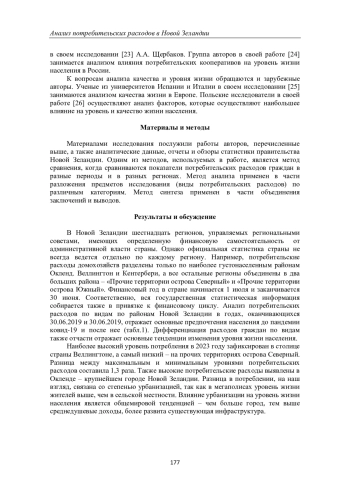 В период турбулентности и неопределенности, санкционных войн, которые сейчас наблюдаются в мире, становится актуальным производить оценку социально-экономической ситуации в различных странах. Стандарты жизни населения четко отражают состояние экономики этих стран, а потребительские расходы являются хорошим индикатором уровня жизни населения. Размер и структура расходов граждан на потребление отражают их приоритеты в анализируемом периоде. Новая Зеландия наряду с другими странами Запада вводит санкции против России. В связи с чем, вызывает интерес состояние экономики этой страны, а также стандарты жизни человека в ней. В настоящей статье проведен анализ потребительских расходов граждан Новой Зеландии в 2019 и 2023 гг. с целью определения уровня жизни населения и влияния на него различных факторов. В результате проведенной оценки выявлено, что произошло небольшое воздействие пандемии короноавируса на структуру расходов жителей Новой Зеландии. Установлено влияние урбанизации на потребительские расходы жителей страны. В урбанизированных районах расходы на потребление выше, чем в сельской местности, что связано с более высоким уровнем жизни, а также более высокими потребностями и более высокими ценами, чем на аналогичные товары, услуги в малозаселенных районах. Также выявлено, что в домохозяйствах, состоящих из одного человека и из пяти и более человек, уровень жизни несколько ниже, чем в домохозяйствах средних размеров. Это связано с тем, что малые домохозяйства преимущественно состоят из пенсионеров, а в крупных домохозяйствах большую долю занимают дети.