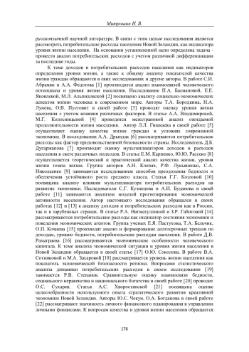 К теме доходов и потребительских расходов населения как индикаторов определения уровня жизни, а также к общему анализу показателей качества жизни граждан обращаются в свих исследованиях и другие авторы. В работе С. И. Абрамян и А. А. Федотова [1] производится анализ взаимосвязей человеческого потенциала и уровня жизни населения. Исследование П. А. Басмановой, Е. Е. Яковлевой, М. Л. Альпидовской [2] посвящено анализу социально-экономических аспектов жизни человека в современном мире. Авторы Т. А. Бородкина, Н. А. Лунева, О. В. Пустовит в своей работе [3] проводят оценку уровня жизни населения с учетом влияния различных факторов. В статье А. А. Владимирской, М. Г. Колосницыной [4] проводится межстрановой анализ ожидаемой продолжительности жизни населения. Автор Л. Л. Гишкаева в своей работе [5] осуществляет оценку качества жизни граждан в условиях современной экономики. В исследовании А. А. Дрындак [6] рассматриваются потребительские расходы как фактор продовольственной безопасности страны. Исследователь Д. Б. Дугаржапова [7] производит оценку мультипликаторов доходов и расходов населения в свете различных подходов.