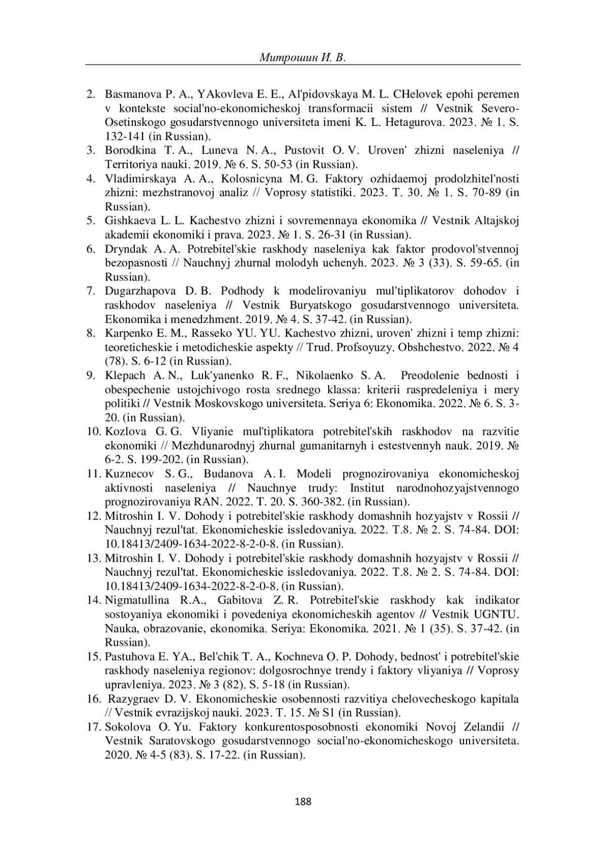 13. Митрошин И. В. Доходы и потребительские расходы домашних хозяйств в России // Научный результат. Экономические исследования. 2022. Т.8. № 2. С. 74-84. DOI: 10.18413/2409-1634-2022-8-2-0-8 EDN: LRTXHT