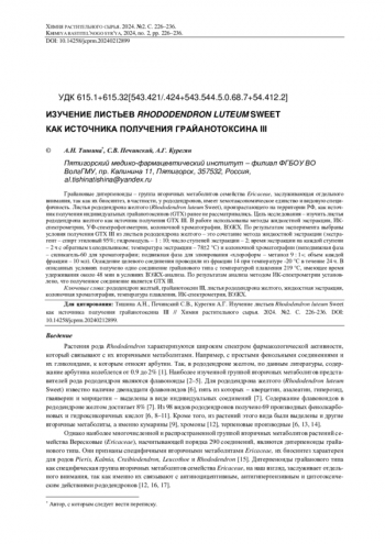 Грайановые дитерпеноиды – группа вторичных метаболитов семейства Ericaceae, заслуживающая отдельного внимания, так как их биосинтез, в частности, у рододендронов, имеет хемотаксономическое единство и видовую специфичность. Листья рододендрона желтого (Rhododendron luteum Sweet), произрастающего на территории РФ, как источник получения индивидуальных грайанотоксинов (GTX) ранее не рассматривались. Цель исследования – изучить листья рододендрона желтого как источник получения GTX III. В работе использованы методы жидкостной экстракции, ИК-спектрометрии, УФ-спектрофотометрии, колоночной хроматографии, ВЭЖХ. По результатам эксперимента выбраны условия получения GTX III из листьев рододендрона желтого – это сочетание метода жидкостной экстракции (экстрагент – спирт этиловый 95%; гидромодуль – 1 : 10; число ступеней экстракции – 2; время экстракции на каждой ступени – 2 ч с обратным холодильником; температура экстракции – 78±2 °С) и колоночной хроматографии (неподвижная фаза – силикагель-60 для хроматографии; подвижная фаза для элюирования «хлороформ – метанол 9 : 1»; объем каждой фракции – 10 мл). Осаждение целевого соединения проводили из фракции 14 при температуре -20 °С в течение 24 ч. В описанных условиях получено одно соединение грайанового типа с температурой плавления 219 °С, имеющее время удерживания около 48 мин в условиях ВЭЖХ-анализа. По результатам анализа методом ИК-спектрометрии установлено, что полученное соединение является GTX III.