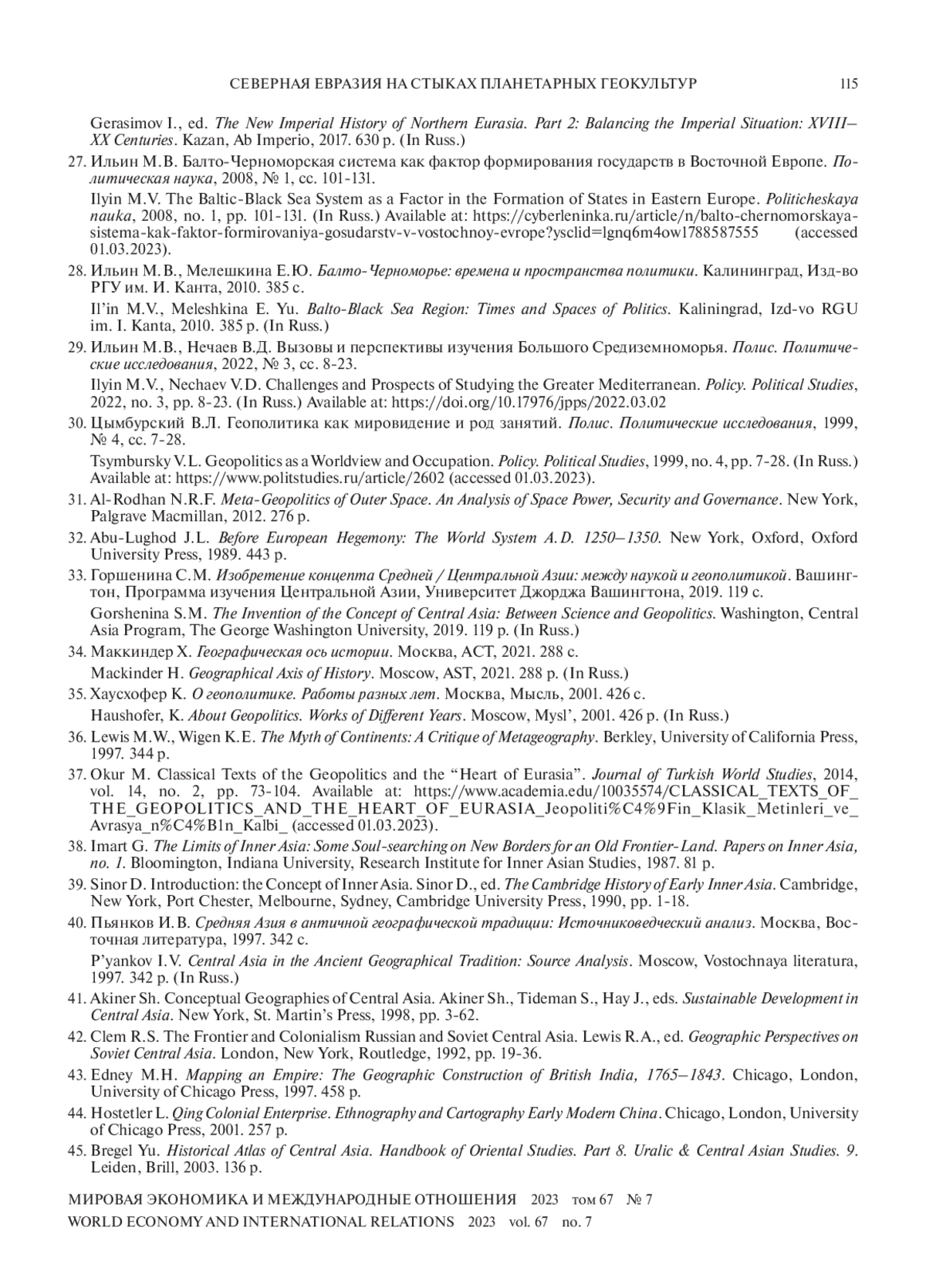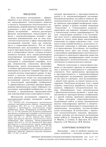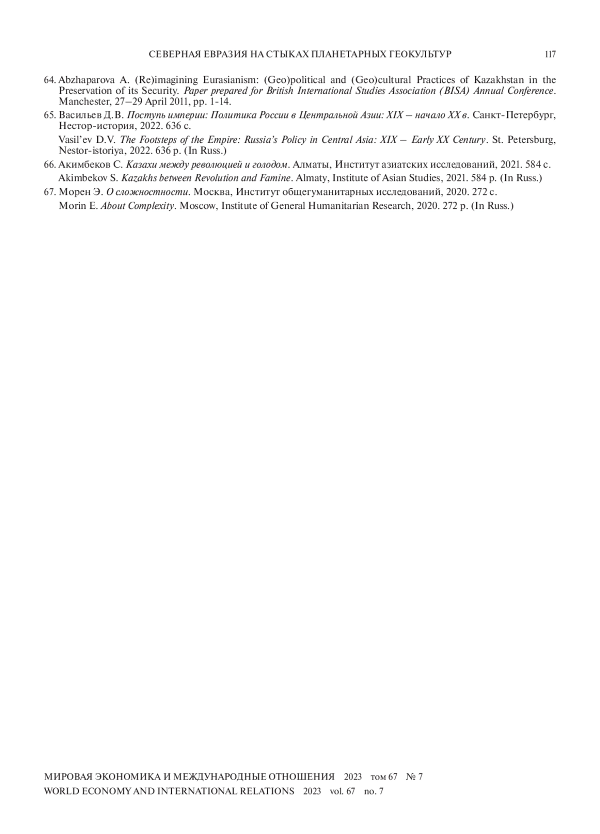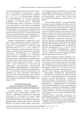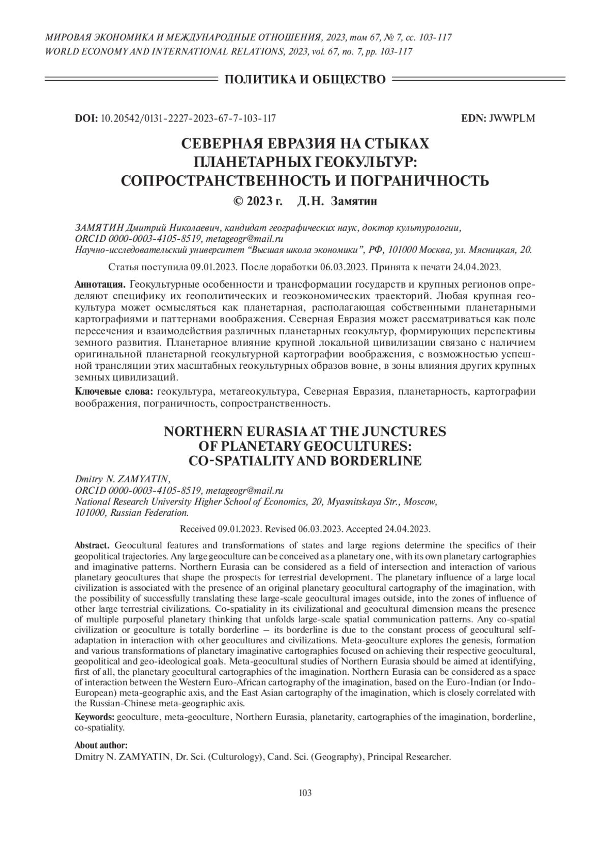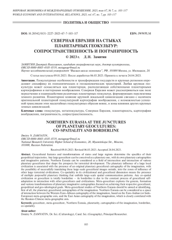 ЗАМЯТИН Д. Н. СЕВЕРНАЯ ЕВРАЗИЯ НА СТЫКАХ ПЛАНЕТАРНЫХ ГЕОКУЛЬТУР: СОПРОСТРАНСТВЕННОСТЬ И ПОГРАНИЧНОСТЬ // МИРОВАЯ ЭКОНОМИКА И МЕЖДУНАРОДНЫЕ ОТНОШЕНИЯ. 2024. Т. 67 № 7