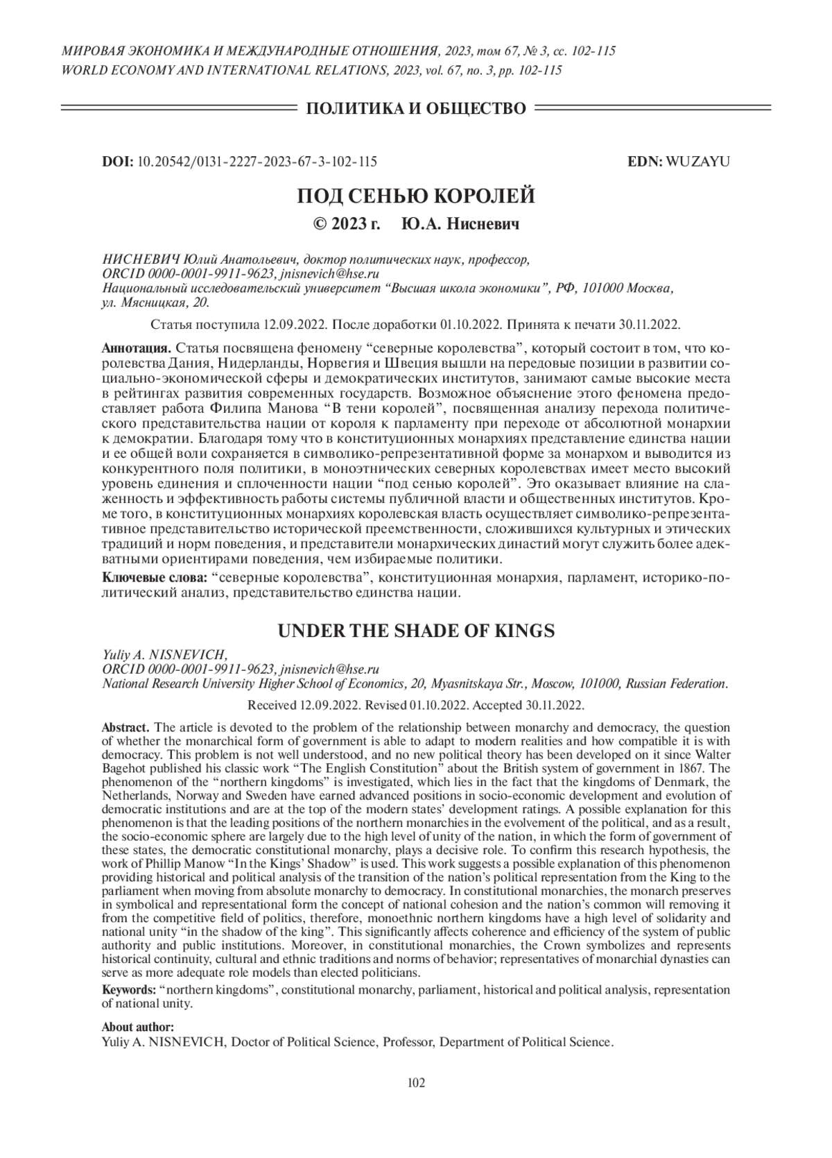 Статья посвящена феномену “северные королевства”, который состоит в том, что королевства Дания, Нидерланды, Норвегия и Швеция вышли на передовые позиции в развитии социально-экономической сферы и демократических институтов, занимают самые высокие места в рейтингах развития современных государств. Возможное объяснение этого феномена предоставляет работа Филипа Манова “В тени королей”, посвященная историко-политическому анализу перехода политического представительства нации от короля к парламенту при переходе от абсолютной монархии к демократии. Благодаря тому, что в конституционных монархиях представление единства нации и ее общей воли сохраняется в символико-репрезентативной форме за монархом и выводится из конкурентного поля политики, в моноэтнических северных королевствах имеет место высокий уровень единения и сплоченность нации “под сенью королей”. Это существенно влияет на слаженность и эффективность работы системы публичной власти и общественных институтов. Кроме того, в конституционных монархиях королевская власть осуществляет символико-репрезентативное представительство исторической преемственности, сложившихся культурных и этических традиций и норм поведения, и представители монархических династий могут служить более адекватными ориентирами поведения, чем избираемые политики.