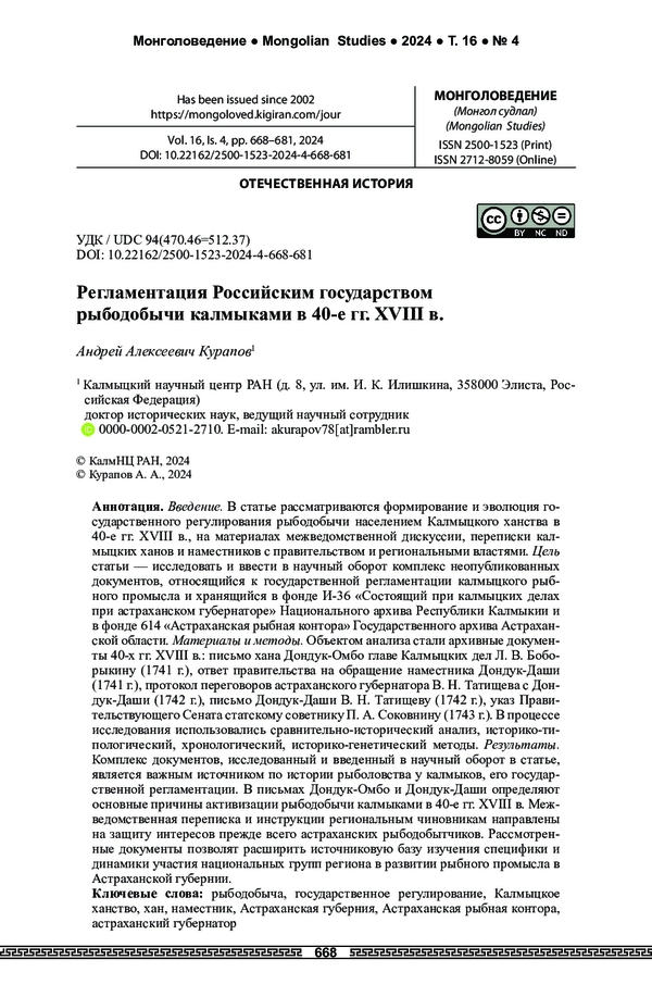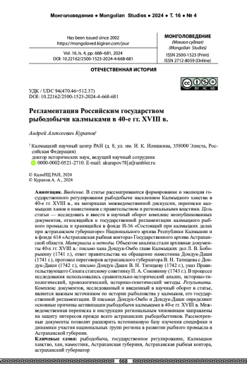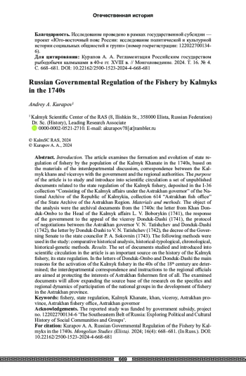 Введение. В статье рассматриваются формирование и эволюция государственного регулирования рыбодобычи населением Калмыцкого ханства в 40-е гг. XVIII в., на материалах межведомственной дискуссии, переписки калмыцких ханов и наместников с правительством и региональными властями. Цель статьи — исследовать и ввести в научный оборот комплекс неопубликованных документов, относящийся к государственной регламентации калмыцкого рыбного промысла и хранящийся в фонде И-36 «Состоящий при калмыцких делах при астраханском губернаторе» Национального архива Республики Калмыкии и в фонде 614 «Астраханская рыбная контора» Государственного архива Астраханской области. Материалы и методы. Объектом анализа стали архивные документы 40-х гг. XVIII в.: письмо хана Дондук-Омбо главе Калмыцких дел Л. В. Боборыкину (1741 г.), ответ правительства на обращение наместника Дондук-Даши (1741 г.), протокол переговоров астраханского губернатора В. Н. Татищева с Дондук-Даши (1742 г.), письмо Дондук-Даши В. Н. Татищеву (1742 г.), указ Правительствующего Сената статскому советнику П. А. Соковнину (1743 г.). В процессе исследования использовались сравнительно-исторический анализ, историко-типологический, хронологический, историко-генетический методы. Результаты. Комплекс документов, исследованный и введенный в научный оборот в статье, является важным источником по истории рыболовства у калмыков, его государственной регламентации. В письмах Дондук-Омбо и Дондук-Даши определяют основные причины активизации рыбодобычи калмыками в 40-е гг. XVIII в. Межведомственная переписка и инструкции региональным чиновникам направлены на защиту интересов прежде всего астраханских рыбодобытчиков. Рассмотренные документы позволят расширить источниковую базу изучения специфики и динамики участия национальных групп региона в развитии рыбного промысла в Астраханской губернии.
