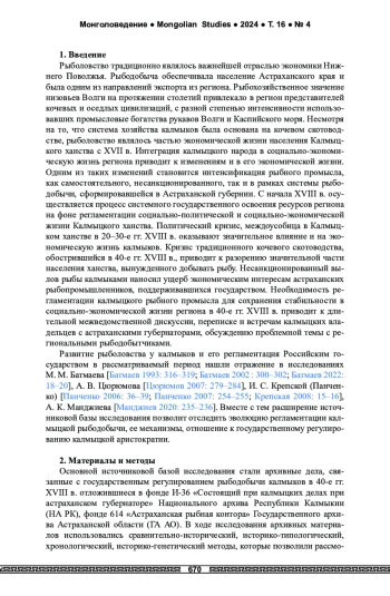 Развитие рыболовства у калмыков и его регламентация Российским государством в рассматриваемый период нашли отражение в исследованиях М. М. Батмаева [Батмаев 1993: 316–319; Батмаев 2002: 300–302; Батмаев 2022: 18–20], А. В. Цюрюмова [Цюрюмов 2007: 279–284], И. С. Крепской (Панченко) [Панченко 2006: 36–39; Панченко 2007: 254–255; Крепская 2008: 15–16], А. К. Манджиева [Манджиев 2020: 235–236]. Вместе с тем расширение источниковой базы исследования позволит отследить эволюцию регламентации калмыцкой рыбодобычи, ее механизмы, отношение к государственному регулированию калмыцкой аристократии.