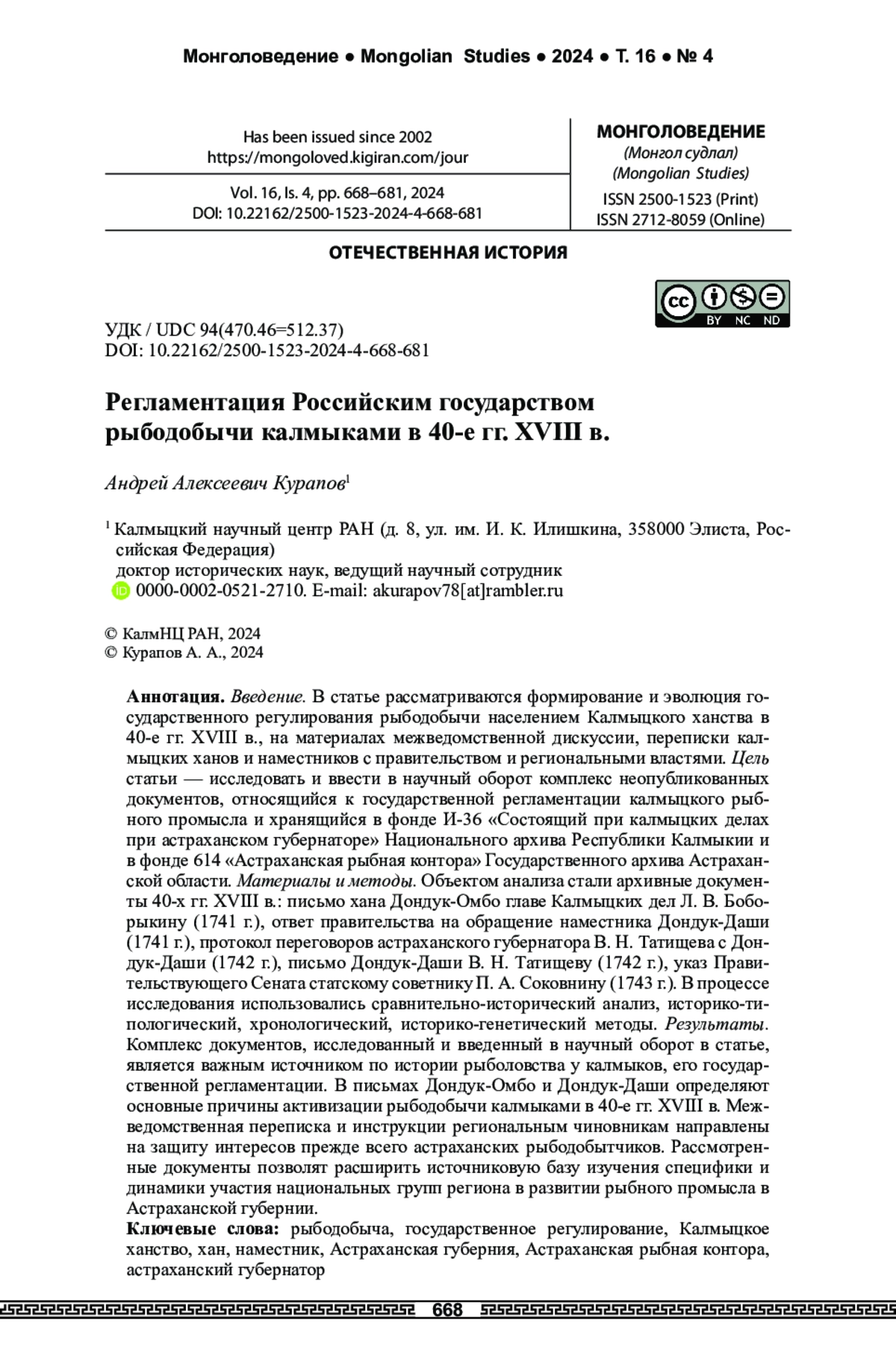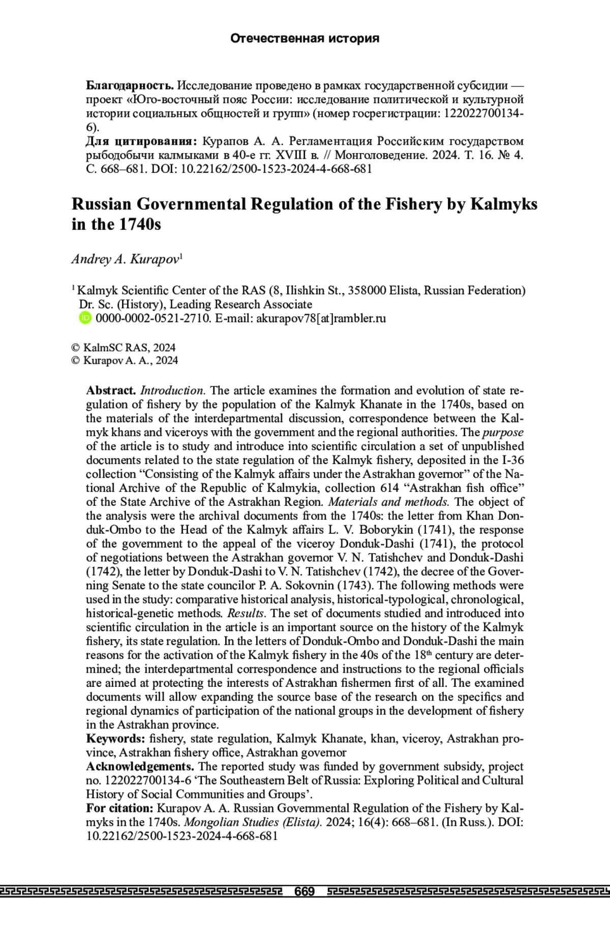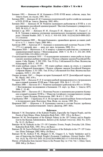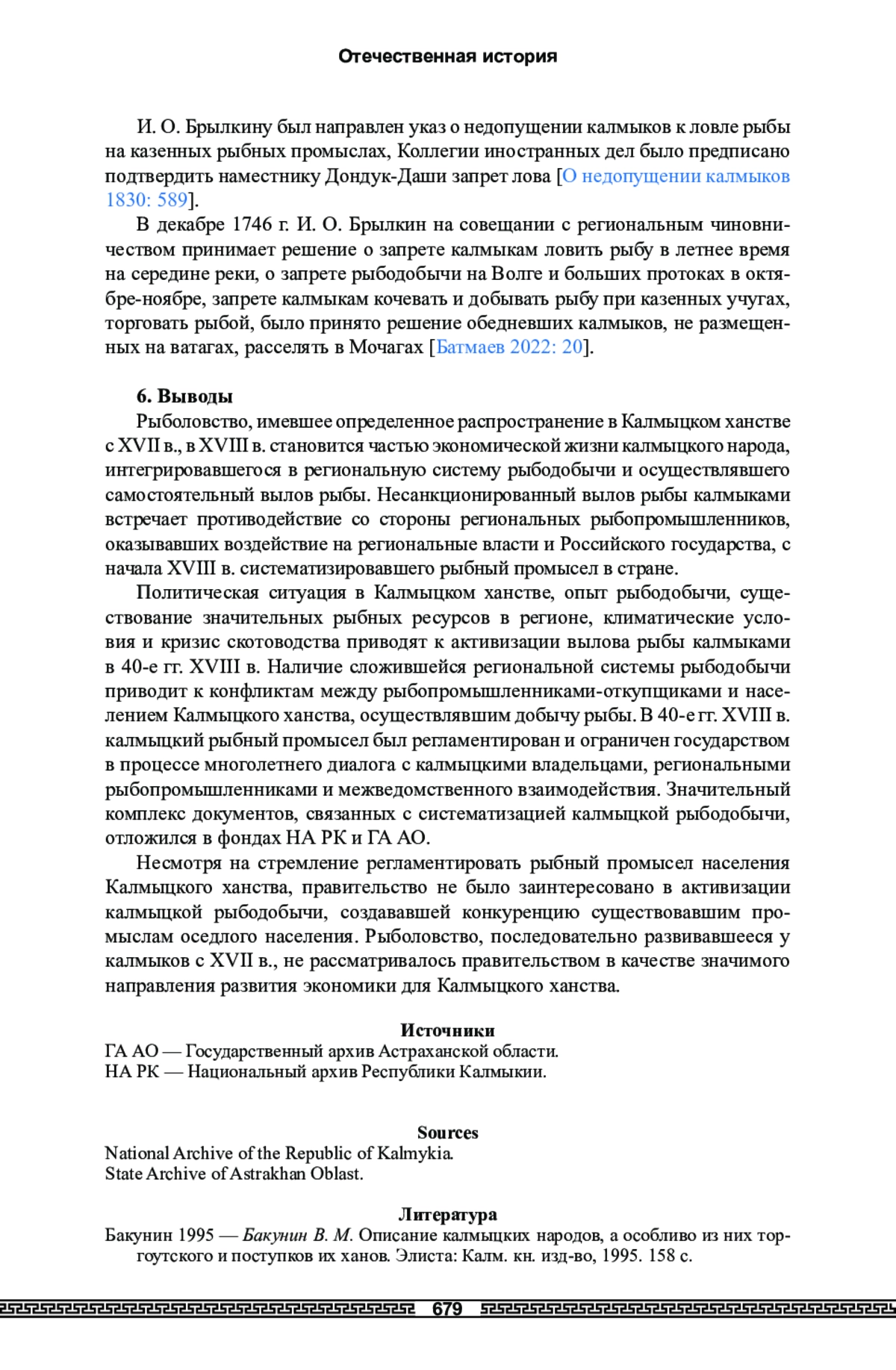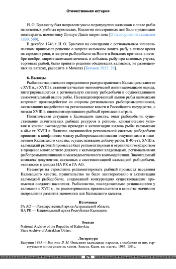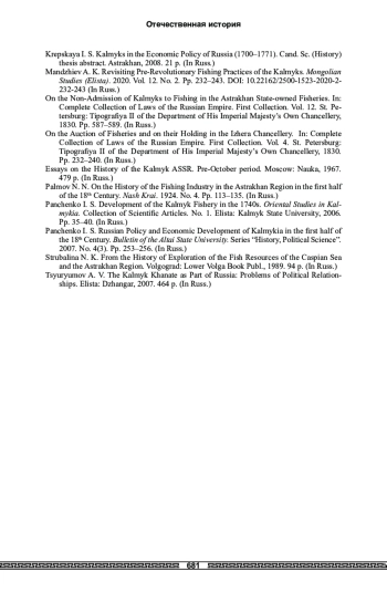 6. Батмаев 2022 - Батмаев М. М. Развитие калмыцкого рыболовства в XVIII в. и его регулирование российской администрацией // Вестник Калмыцкого университета. 2022. № 3(55). С. 14-21.