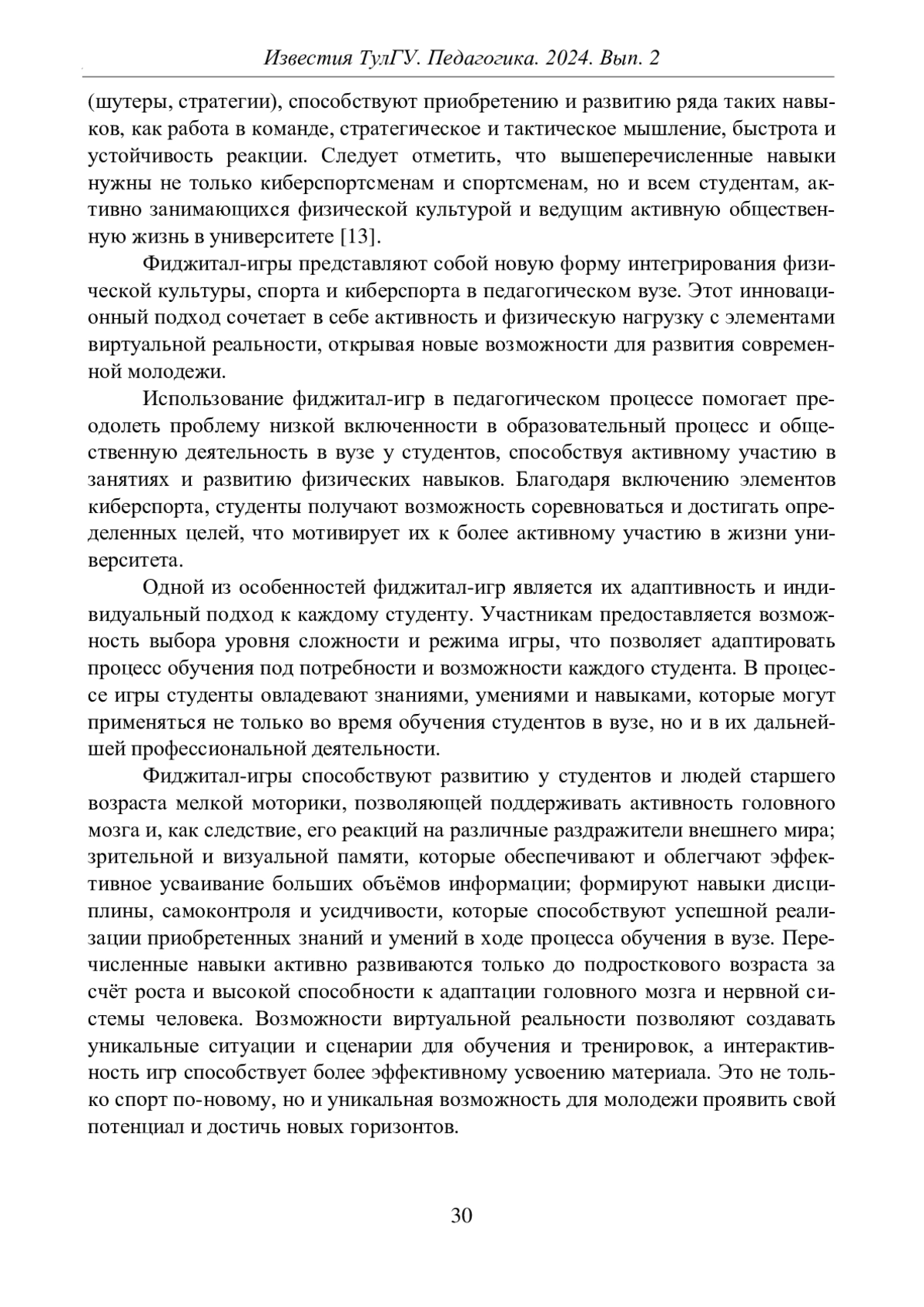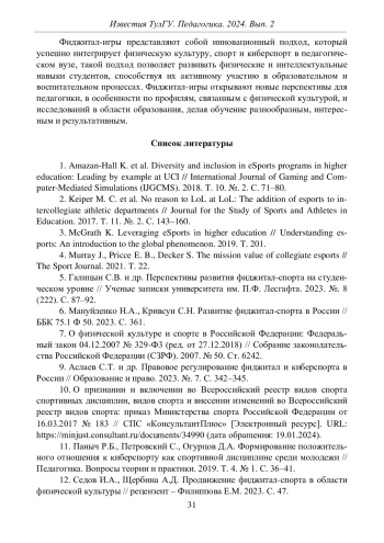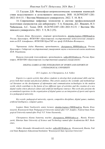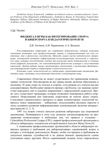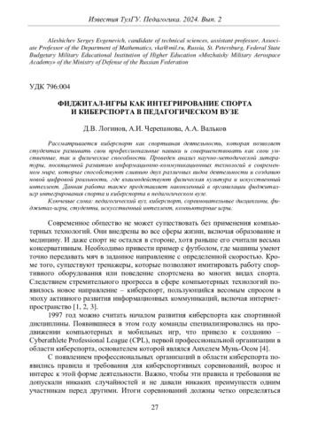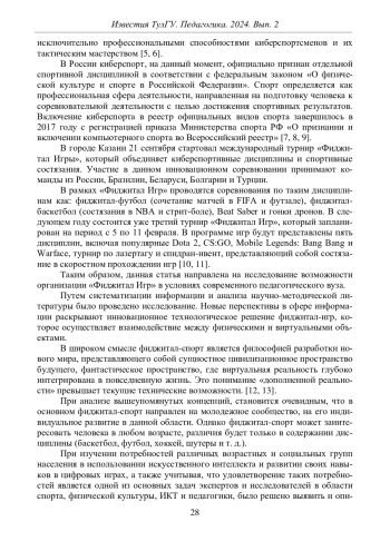 ЛОГИНОВ Д. В., ЧЕРЕПАНОВА А. И., ВАЛЬКОВ А. А. ФИДЖИТАЛ-ИГРЫ КАК ИНТЕГРИРОВАНИЕ СПОРТА И КИБЕРСПОРТА В ПЕДАГОГИЧЕСКОМ ВУЗЕ // ИЗВЕСТИЯ ТУЛЬСКОГО ГОСУДАРСТВЕННОГО УНИВЕРСИТЕТА. ПЕДАГОГИКА. 2024. № 2