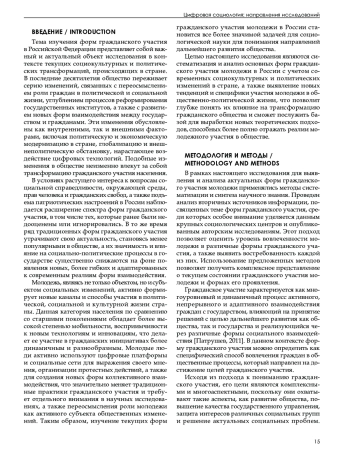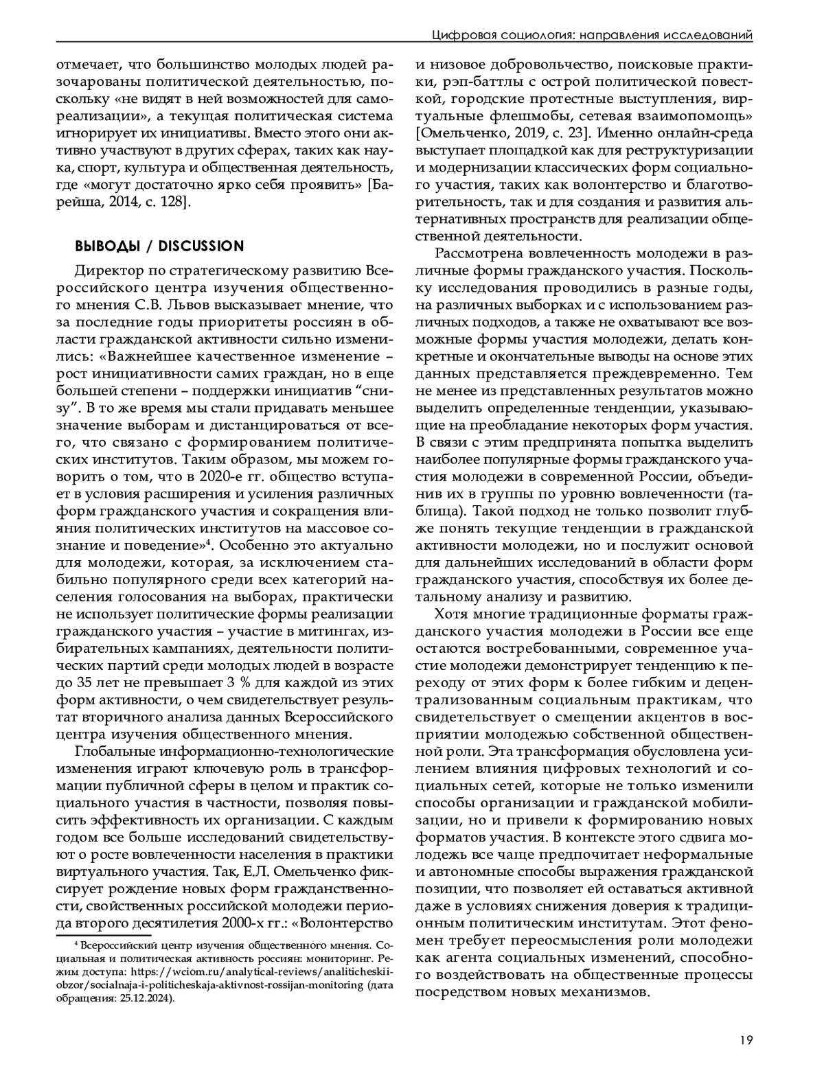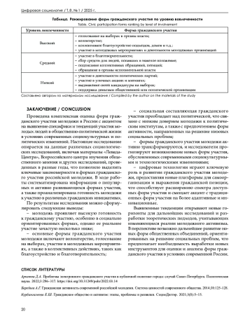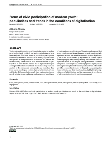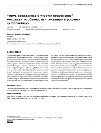 Проанализированы формы гражданского участия молодежи в Российской Федерации в контексте современных социокультурных, политических и технологических изменений. Систематизированы основные формы гражданского участия молодежи с акцентом на выявление новых тенденций и специфики их участия в общественно-политической жизни страны. Рассмотрен переход от традиционных форм участия к более гибким форматам, обусловленный развитием цифровых технологий. Методология включает анализ результатов работ исследователей и вторичных данных крупных социологических центров. Особое внимание уделено различиям в формах гражданского участия молодежи, а также факторам, объясняющим преобладание социальных форм участия над политическими. Основные результаты показали, что молодежь проявляет высокую готовность к участию в социально значимых действиях, однако реальная вовлеченность часто существенно ниже и обусловлена возрастными и социальными факторами. Цифровые технологии играют ключевую роль, создавая новые каналы для выражения гражданской позиции. На основе проведенного анализа формы участия классифицированы по степени вовлеченности молодежи, что позволяет прогнозировать будущие тенденции молодежной активности. Настоящее исследование предоставляет комплексный анализ форм гражданского участия молодежи в Российской Федерации и их трансформаций, подчеркивая значимость цифровизации и возникновения новых форм самоорганизации в развитии гражданского общества.