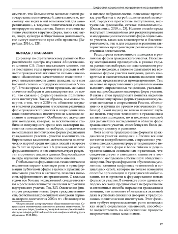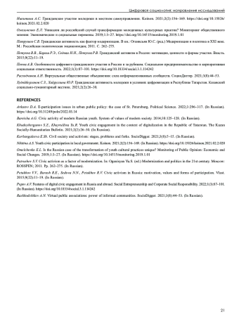10. Худойберганов С.З., Хайруллина Ю.Р. Гражданская активность молодежи в условиях цифровизации в Республике Татарстан. Казанский социально-гуманитарный вестник. 2021;2(2):26-30.