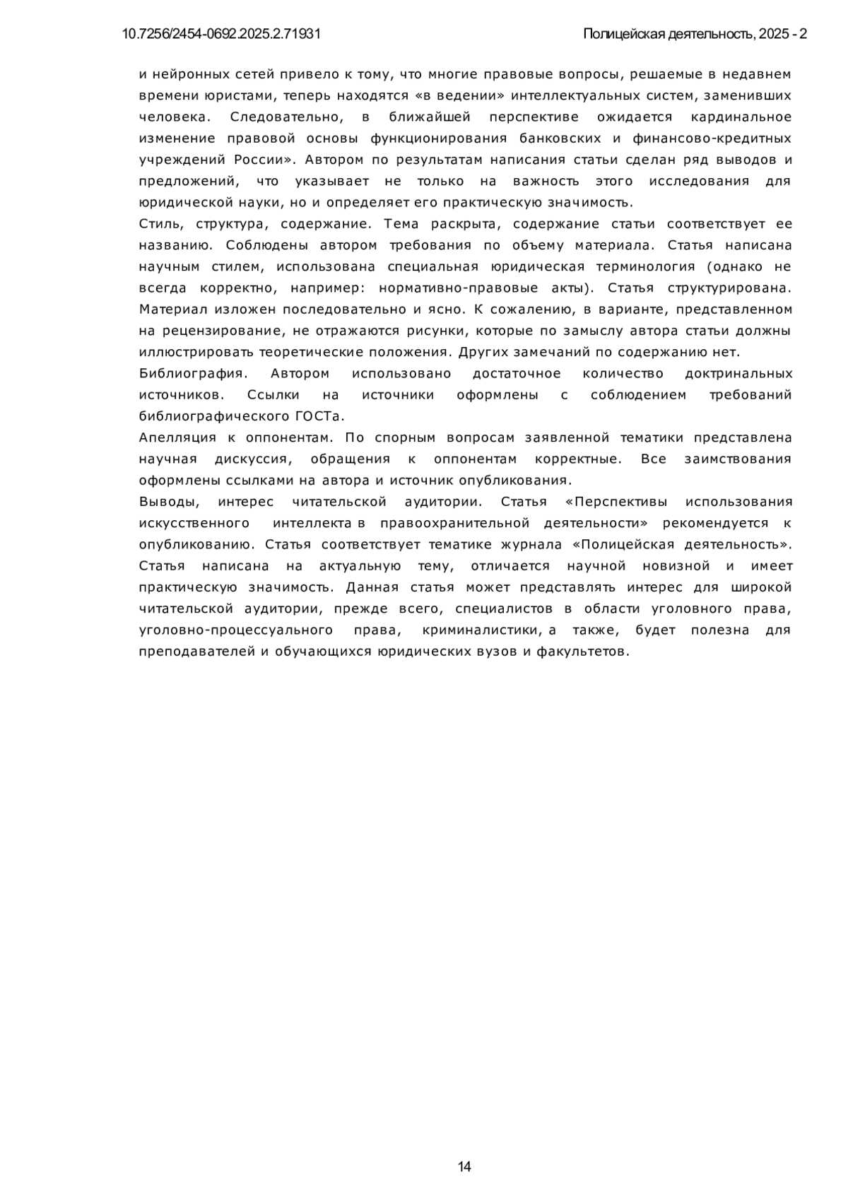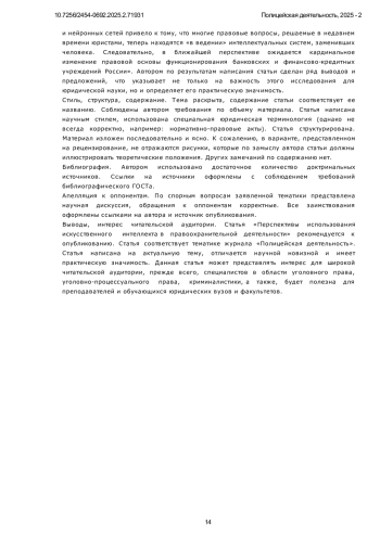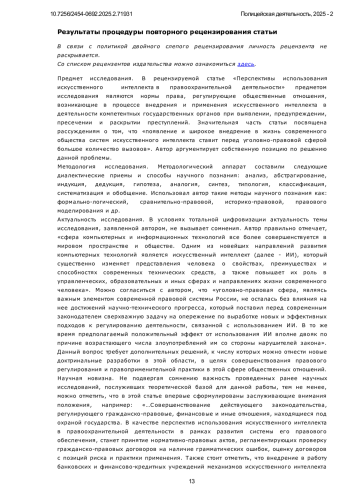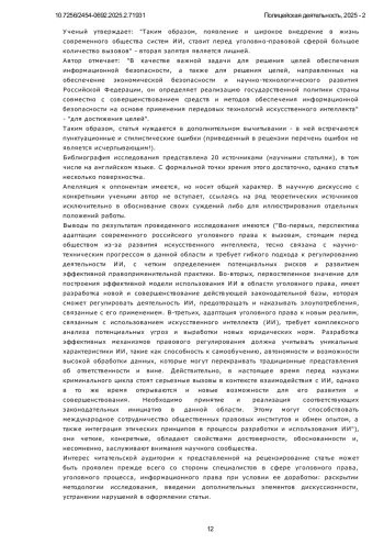 9. Карпика, А. Г. Анализ направлений применения искусственного интеллекта в правоохранительной деятельности // Юристъ-Правоведъ. 2023. № 1(104). С. 130-135.