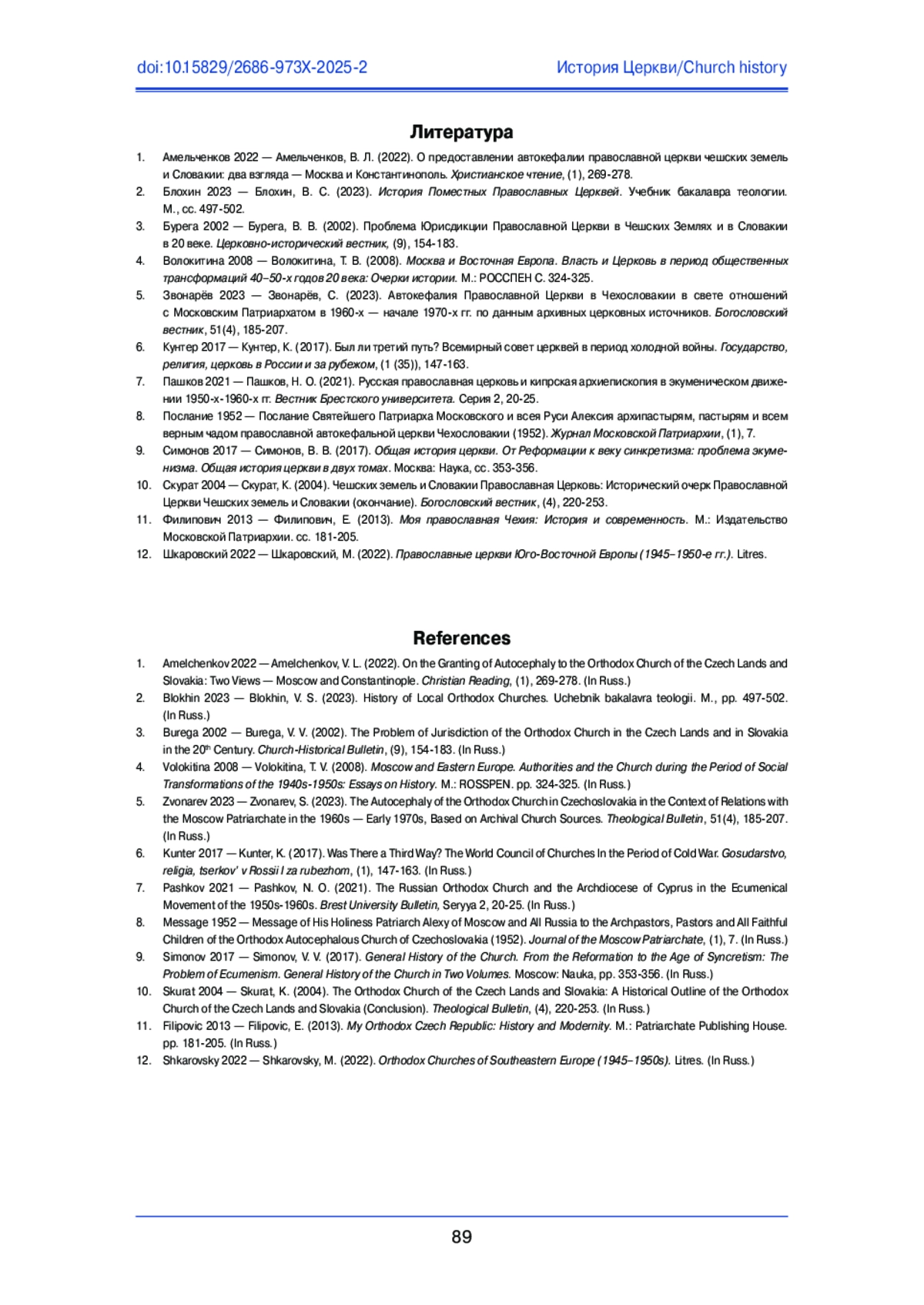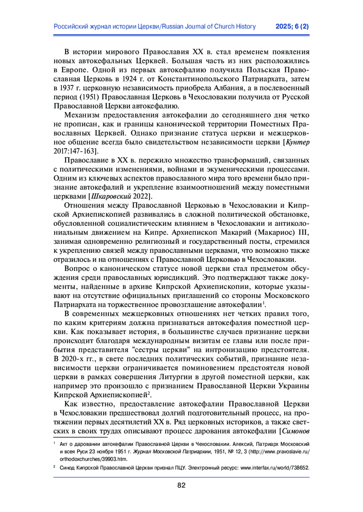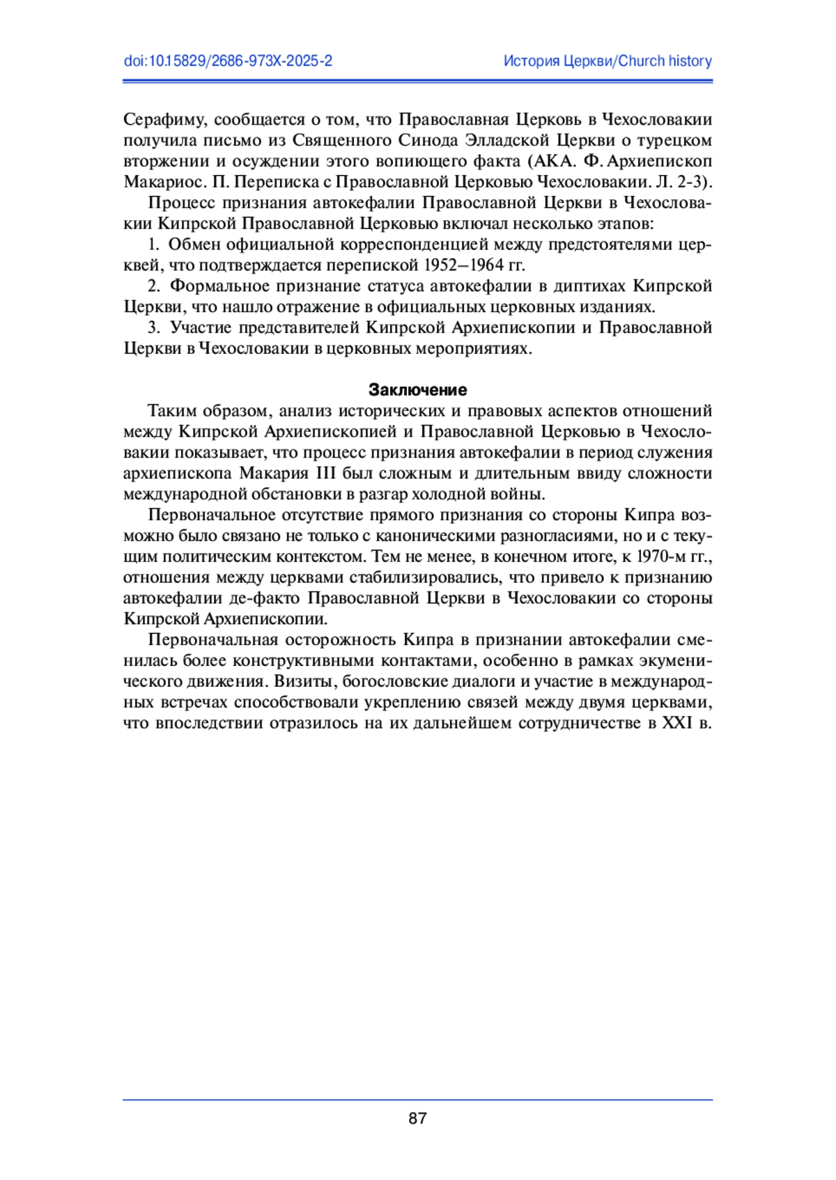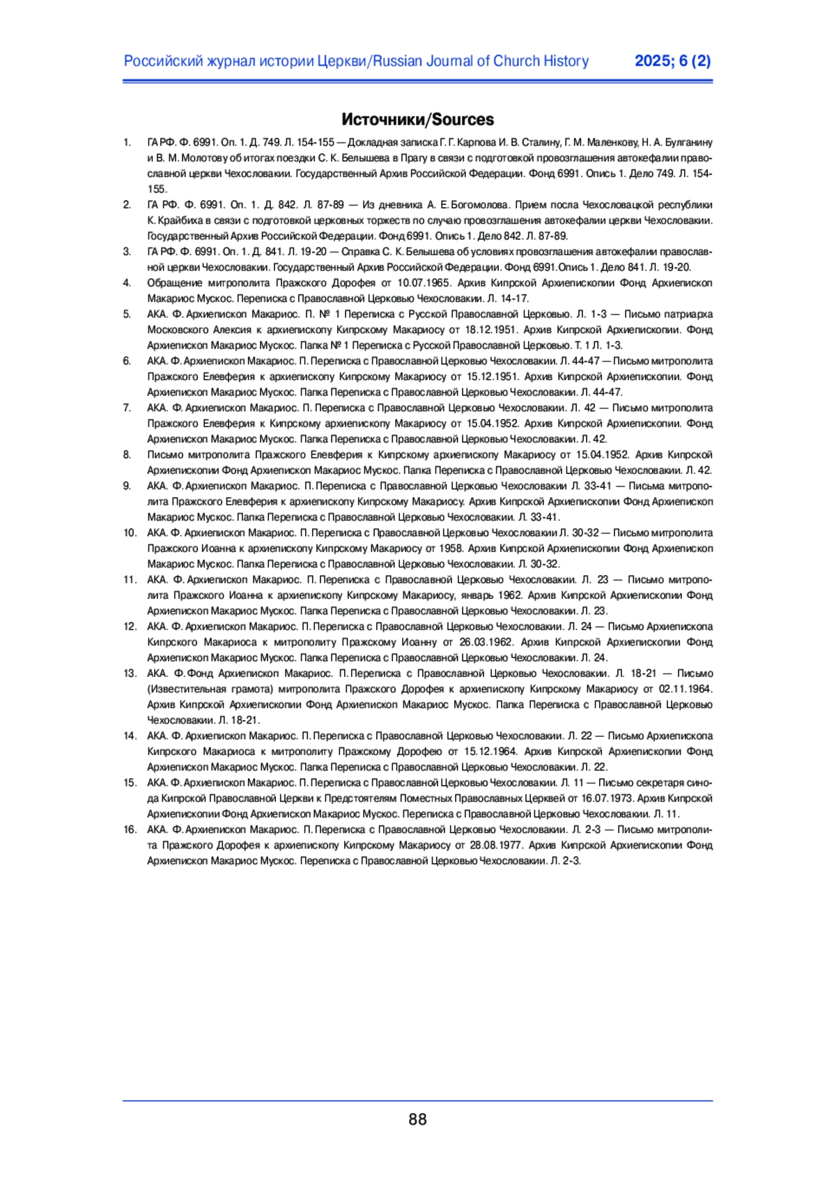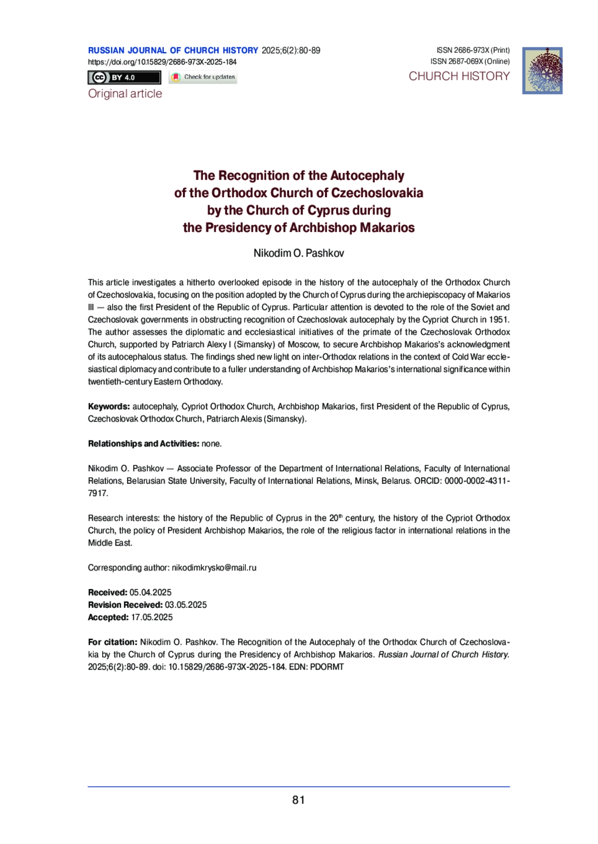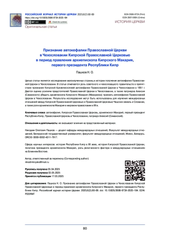 ПАШКОВ Н. О. ПРИЗНАНИЕ АВТОКЕФАЛИИ ПРАВОСЛАВНОЙ ЦЕРКВИ В ЧЕХОСЛОВАКИИ КИПРСКОЙ ПРАВОСЛАВНОЙ ЦЕРКОВЬЮ В ПЕРИОД ПРАВЛЕНИЯ АРХИЕПИСКОПА КИПРСКОГО МАКАРИЯ, ПЕРВОГО ПРЕЗИДЕНТА РЕСПУБЛИКИ КИПР // РОССИЙСКИЙ ЖУРНАЛ ИСТОРИИ ЦЕРКВИ. 2024. ТОМ 6, № 2