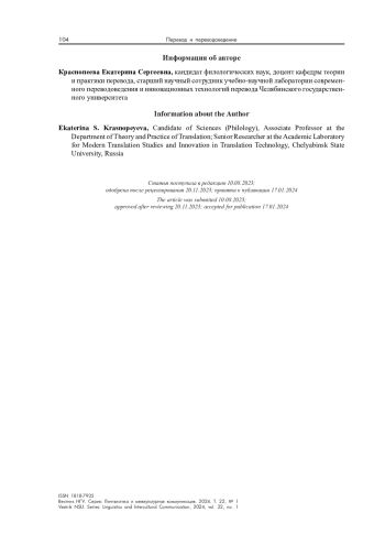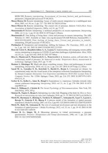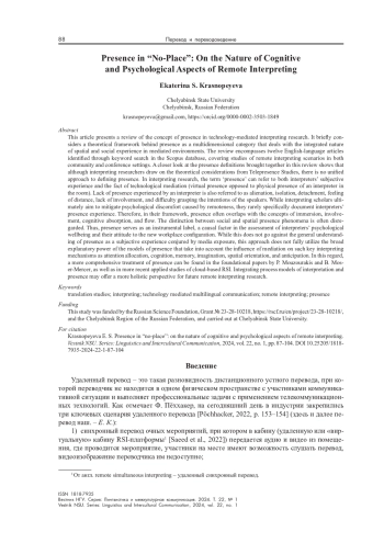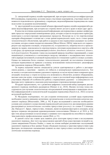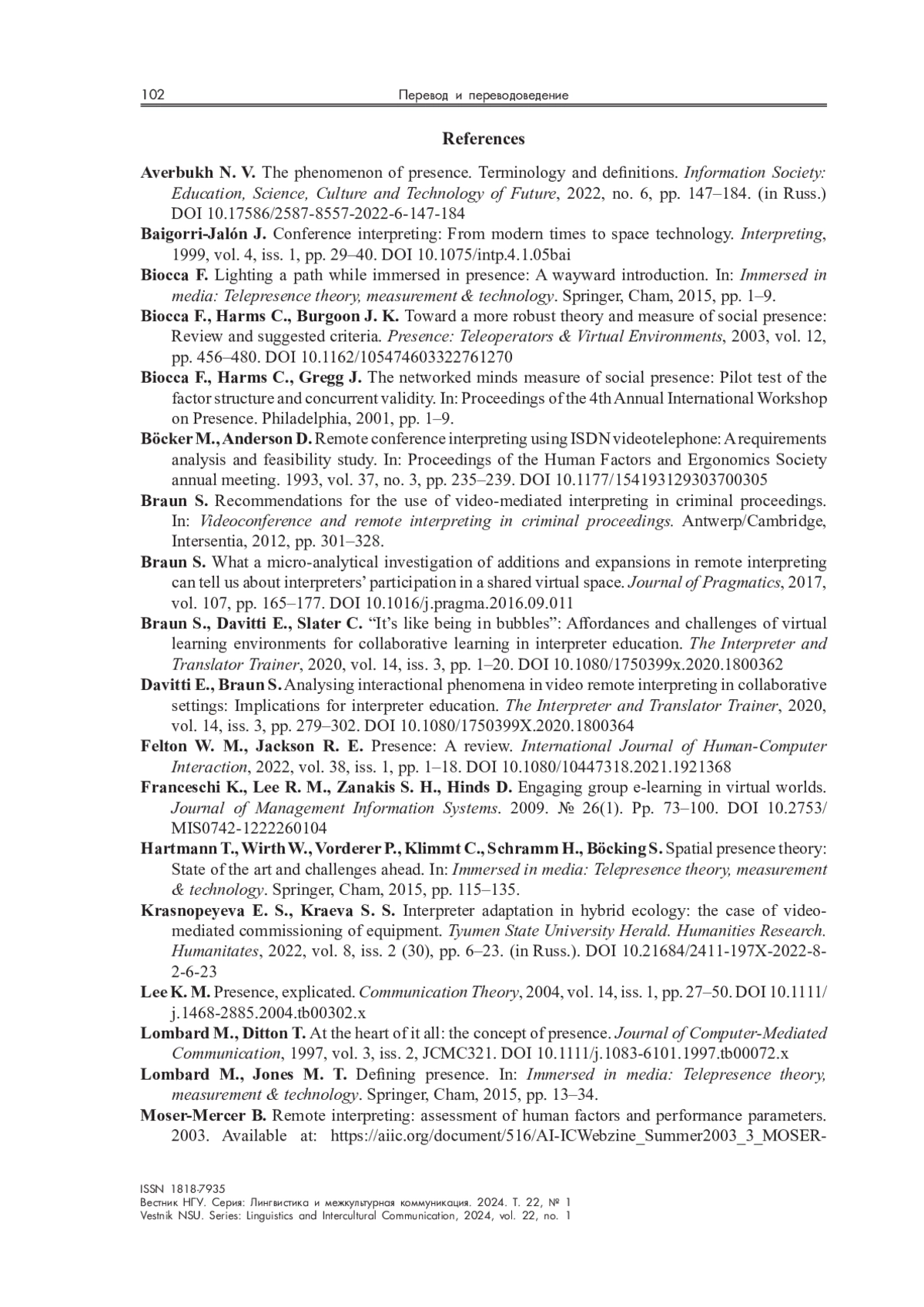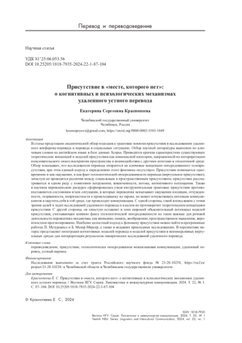 КРАСНОПЕЕВА Е. С. ПРИСУТСТВИЕ В «МЕСТЕ, КОТОРОГО НЕТ»: О КОГНИТИВНЫХ И ПСИХОЛОГИЧЕСКИХ МЕХАНИЗМАХ УДАЛЕННОГО УСТНОГО ПЕРЕВОДА // ВЕСТНИК НГУ. СЕРИЯ: ЛИНГВИСТИКА И МЕЖКУЛЬТУРНАЯ КОММУНИКАЦИЯ. 2024. ТОМ 22, № 1