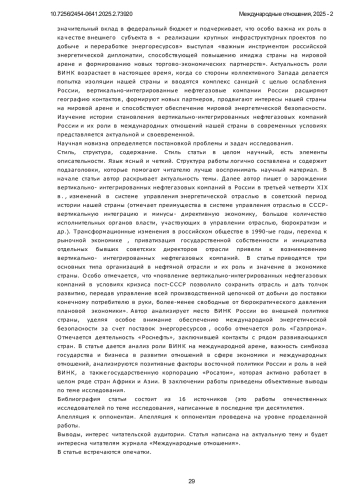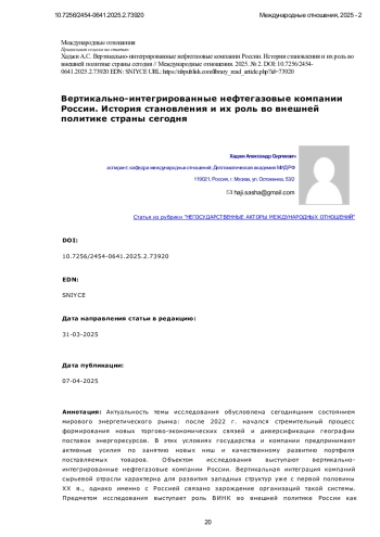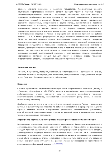 ХАДЖИ А. С. ВЕРТИКАЛЬНО-ИНТЕГРИРОВАННЫЕ НЕФТЕГАЗОВЫЕ КОМПАНИИ РОССИИ. ИСТОРИЯ СТАНОВЛЕНИЯ И ИХ РОЛЬ ВО ВНЕШНЕЙ ПОЛИТИКЕ СТРАНЫ СЕГОДНЯ // МЕЖДУНАРОДНЫЕ ОТНОШЕНИЯ. 2025. № 2