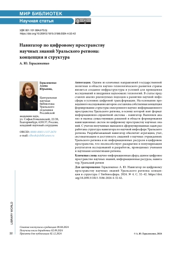 Одним из ключевых направлений государственной политики в области научно-технологического развития страны является создание инфраструктуры и условий для проведения исследований и внедрения наукоемких технологий. В статье представлен анализ реализуемых подходов к развитию научной инфосферы в условиях цифровой трансформации. На основании проведенного исследования автором составлена собственная концепция формирования структуры электронного научно-информационного пространства Уральского региона, в основу которой взят формат информационно-справочной системы – навигатор. Выполнен анализ и оценка существующих решений в области формирования навигационных систем по цифровому пространству научных знаний. С учетом полученных выводов и сформулированных задач разработана структура навигатора по научной инфосфере Уральского региона. Разрабатываемый навигатор обеспечит агрегацию, учет, систематизацию и доступность сведений о научных учреждениях Уральского региона и их информационных ресурсов в цифровом пространстве, что поспособствует раскрытию и популяризации результатов исследований и разработок, проводимых учеными и научными коллективами региона.