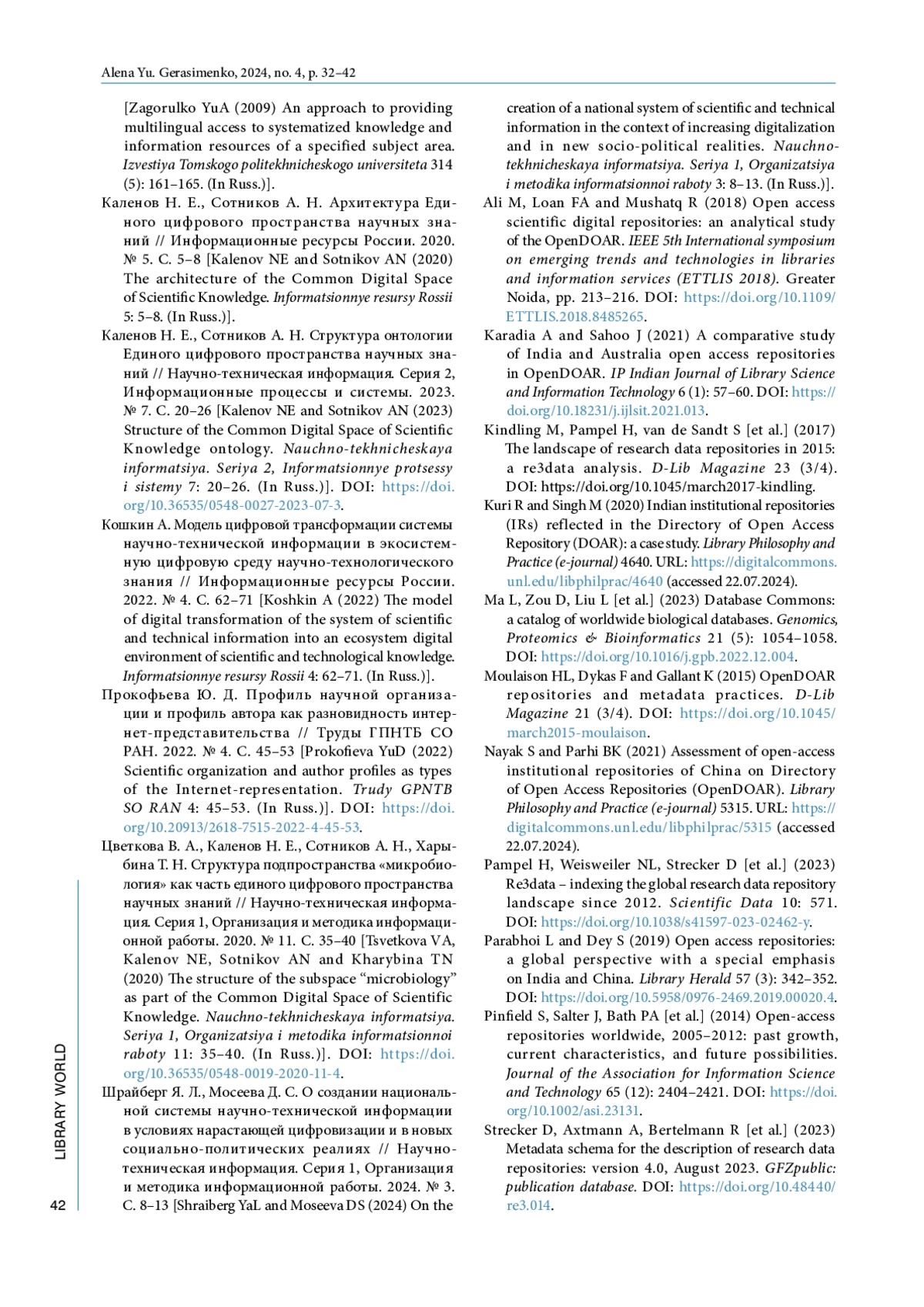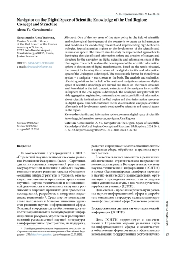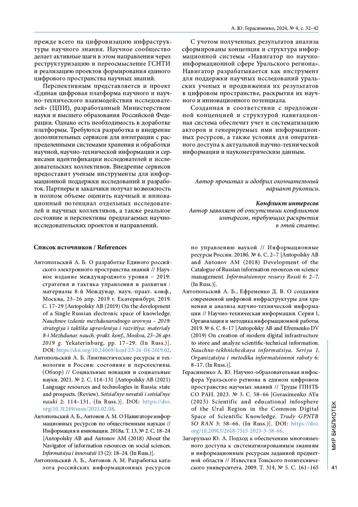 6. Герасименко А. Ю. Научно-образовательная инфосфера Уральского региона в едином цифровом пространстве научных знаний // Труды ГПНТБ СО РАН. 2023. № 3. С. 58-66. https://doi.org/10.20913/2618-7515-2023-3-58-66. [Gerasimenko AYu (2023) Scientific and Educational Infosphere of the Ural Region in the Common Digital Space of Scientific Knowledge. Trudy GPNTB SO RAN 3: 58-66. (In Russ.)]. https://doi.org/10.20913/2618-7515-2023-3-58-66.