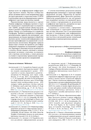 1. Антопольский А. Б. О разработке Единого российского электронного пространства знаний // Научное издание международного уровня - 2019: стратегия и тактика управления и развития: материалы 8-й Междунар. науч.- практ. конф., Москва, 23-26 апр. 2019 г. Екатеринбург, 2019. С. 17-29. [Antopolsky AB (2019) On the development of the Common Russian Electronic Knowledge Space. Nauchnoe izdanie mezhdunarodnogo urovnya - 2019: strategiya i taktika upravleniya i razvitiya: materialy 8-j Mezhdunar. nauch.-prakt. konf., Moskva, 23-26 apr. 2019 g. Yekaterinburg, pp. 17-29. (In Russ.)]. https://doi.org/10.24069/konf-23-26-04-2019.02.
