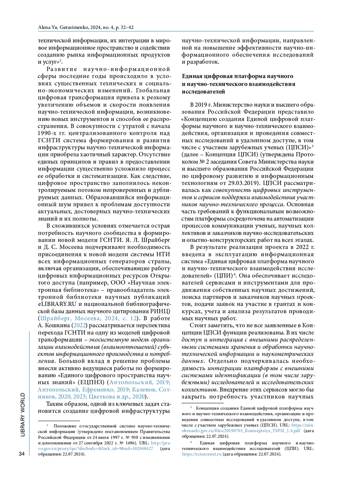 13. Шрайберг Я. Л., Мосеева Д. С. О создании национальной системы научно-технической информации в условиях нарастающей цифровизации и в новых социально-политических реалиях // Научно-техническая информация. Серия 1: Организация и методика информационной работы. 2024. № 3. С. 8-13. https://doi.org/10.36535/0548-0019-2024-03-2. [Shraiberg YaL and Moseeva DS (2024) Building the National System of Sci-tech Information in the conditions of incremental digitalization and new sociopolitical reality. Nauchno-tekhnicheskaya informatsiya. Ser. 1. Organizatsiya i metodika informatsionnoi raboty 3: 8-13. (In Russ.)]. https://doi.org/10.36535/0548-0019-2024-03-2.