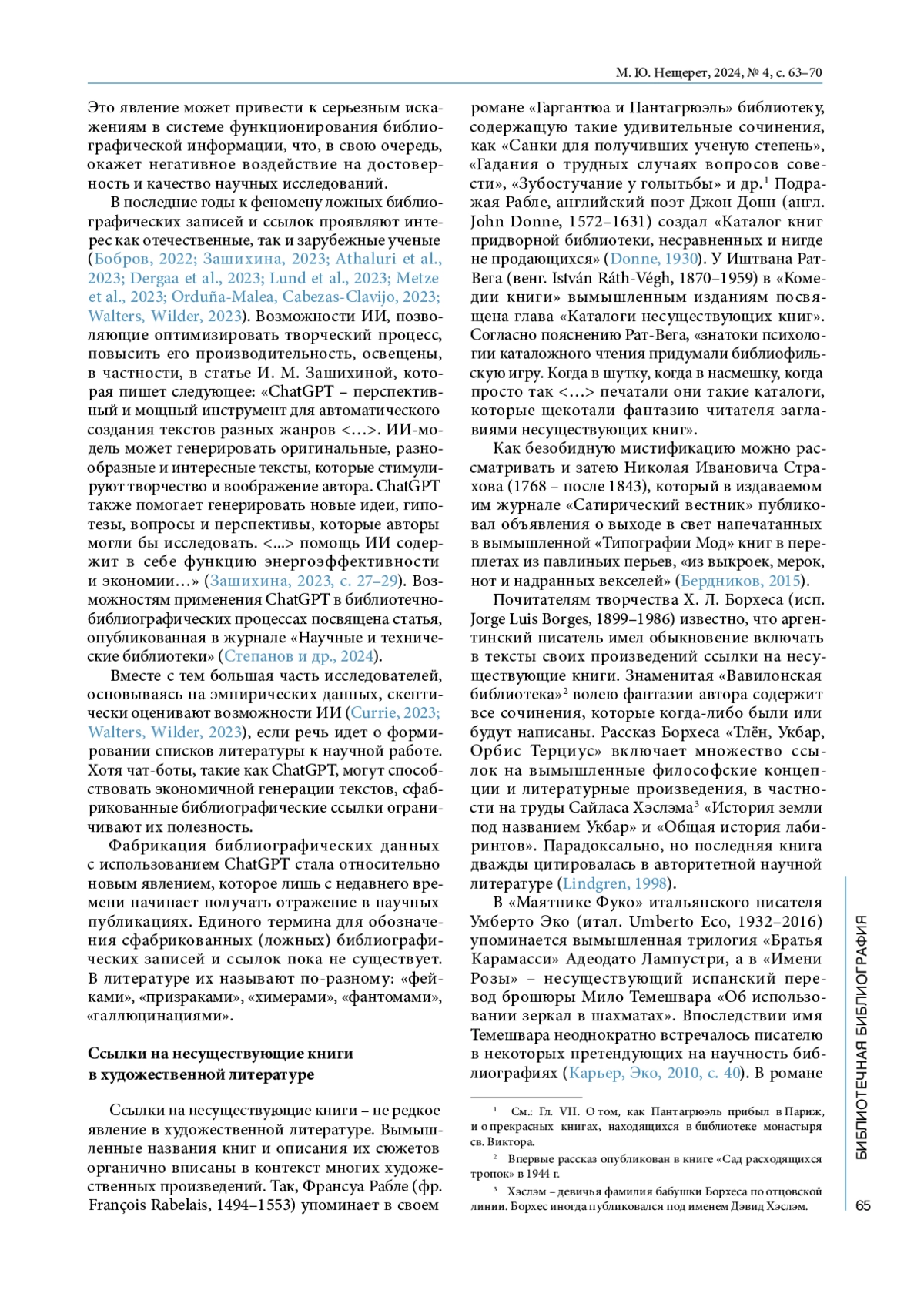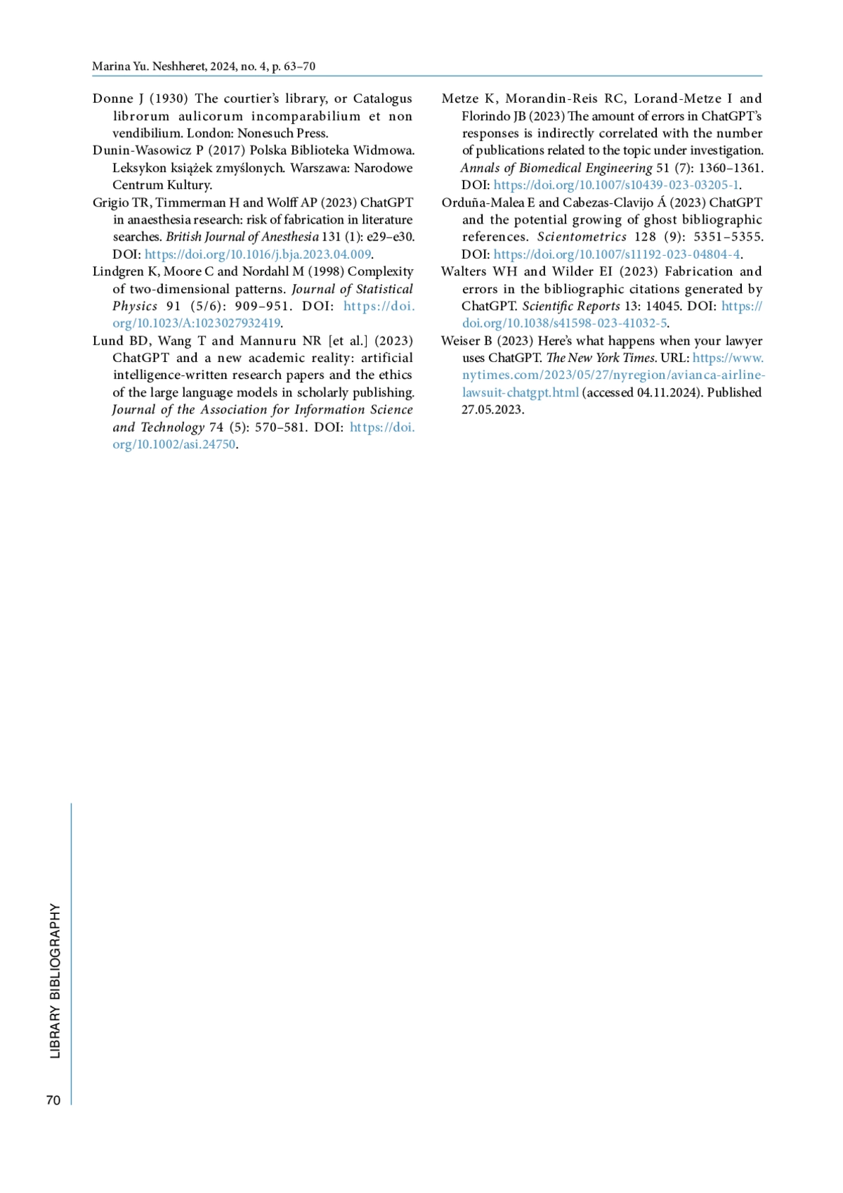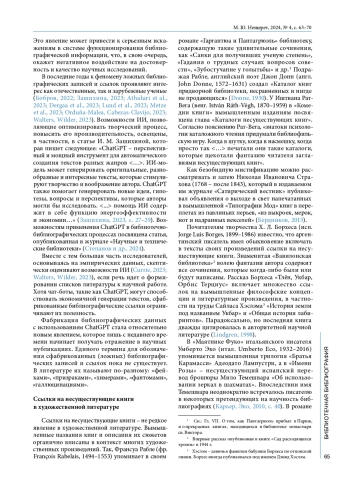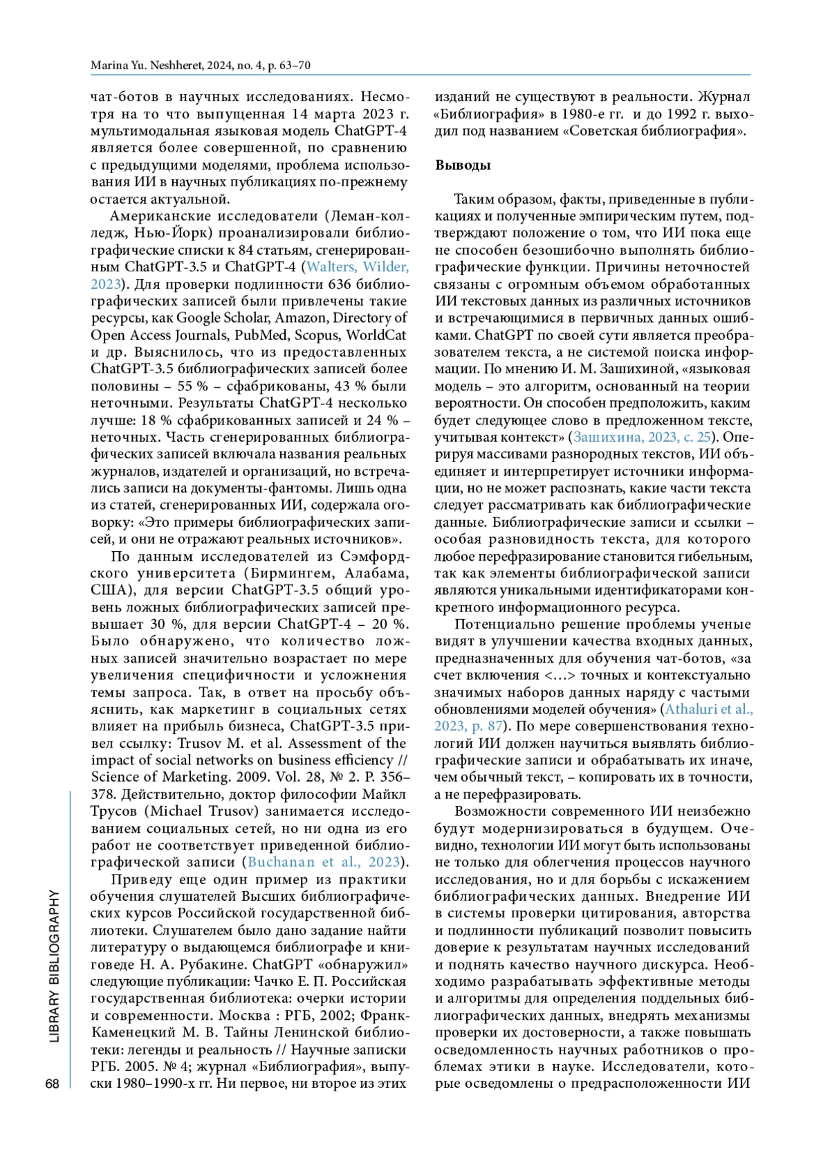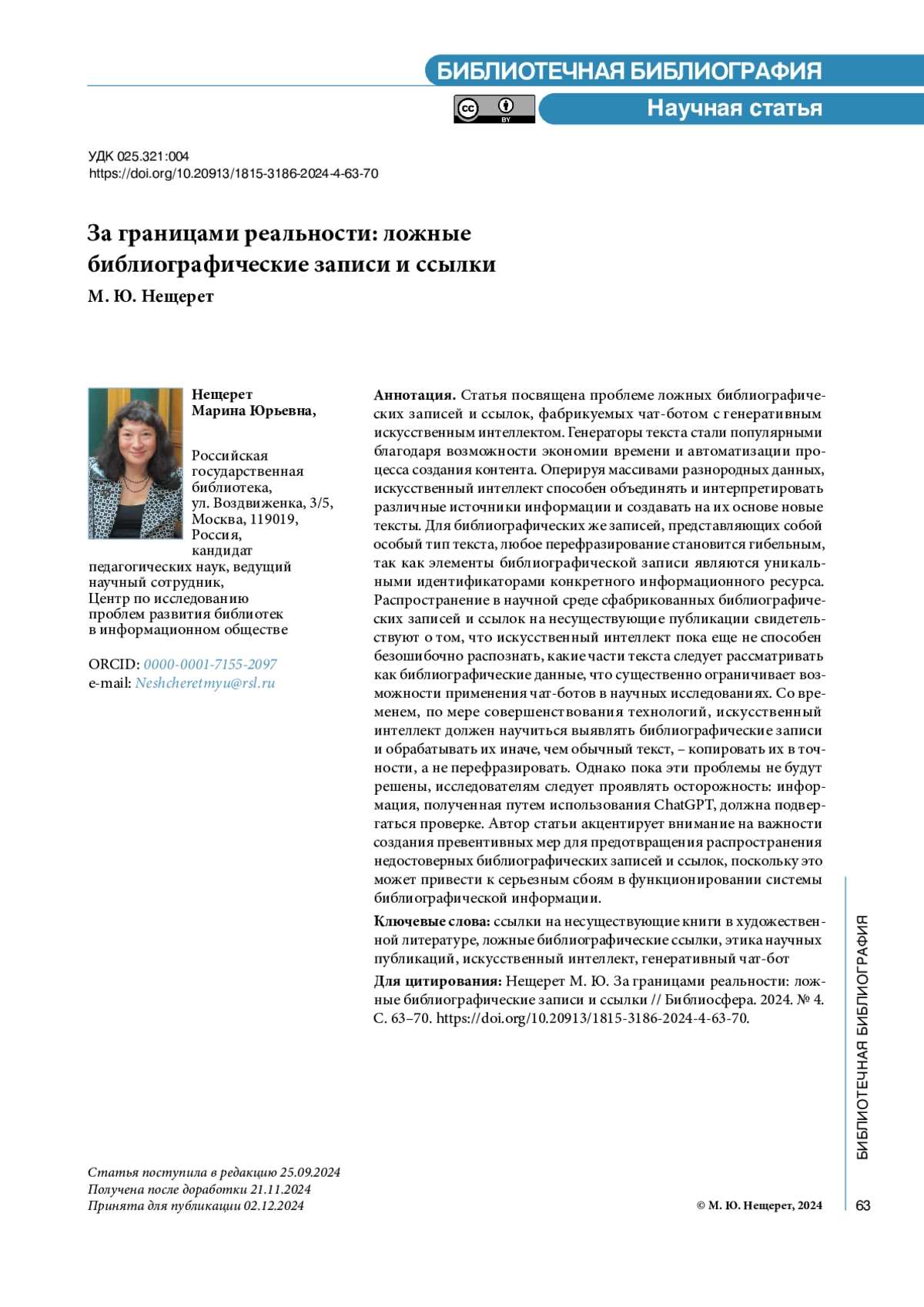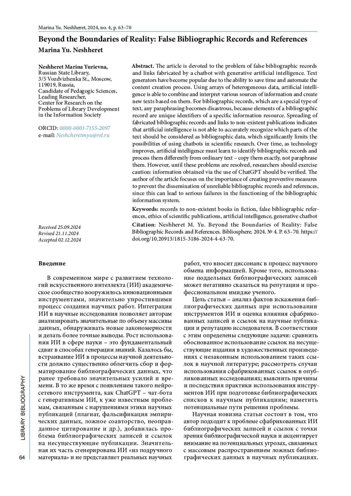Статья посвящена проблеме ложных библиографических записей и ссылок, фабрикуемых чат-ботом с генеративным искусственным интеллектом. Генераторы текста стали популярными благодаря возможности экономии времени и автоматизации процесса создания контента. Оперируя массивами разнородных данных, искусственный интеллект способен объединять и интерпретировать различные источники информации и создавать на их основе новые тексты. Для библиографических же записей, представляющих собой особый тип текста, любое перефразирование становится гибельным, так как элементы библиографической записи являются уникальными идентификаторами конкретного информационного ресурса. Распространение в научной среде сфабрикованных библиографических записей и ссылок на несуществующие публикации свидетельствуют о том, что искусственный интеллект пока еще не способен безошибочно распознать, какие части текста следует рассматривать как библиографические данные, что существенно ограничивает возможности применения чат-ботов в научных исследованиях. Со временем, по мере совершенствования технологий, искусственный интеллект должен научиться выявлять библиографические записи и обрабатывать их иначе, чем обычный текст, – копировать их в точности, а не перефразировать. Однако пока эти проблемы не будут решены, исследователям следует проявлять осторожность: информация, полученная путем использования ChatGPT, должна подвергаться проверке. Автор статьи акцентирует внимание на важности создания превентивных мер для предотвращения распространения недостоверных библиографических записей и ссылок, поскольку это может привести к серьезным сбоям в функционировании системы библиографической информации.