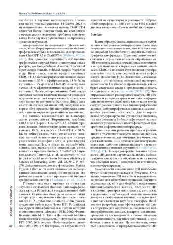 8. Степанов В. К., Маджумдер М. Ш., Бегунова Д. Д. Методика применения большой языковой модели ChatGPT в библиотечно-библиографической деятельности // Научные и технические библиотеки. 2024. № 4. 86-108. https://doi.org/10.33186/1027-3689-2024-4-86-108.