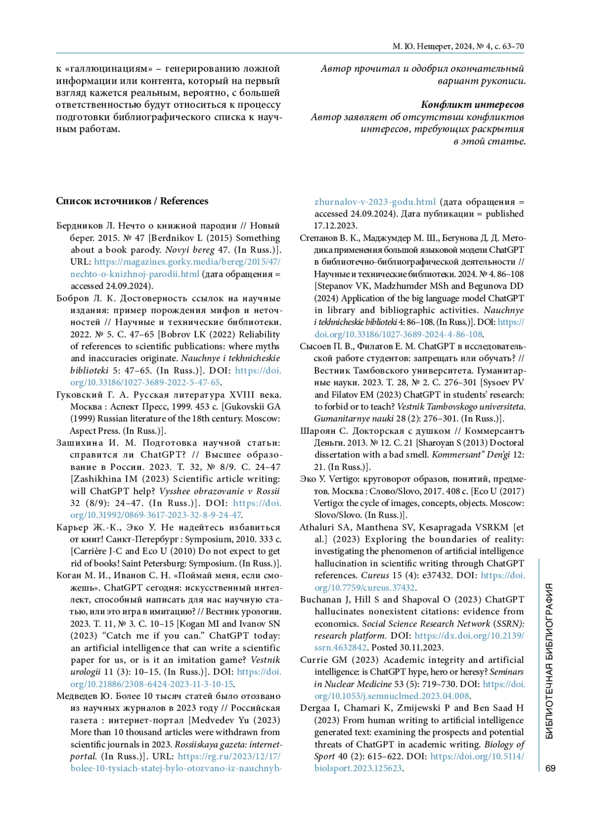 7. Медведев Ю. Более 10 тысяч статей было отозвано из научных журналов в 2023 году // Российская газета : интернет-портал. URL: https://rg.ru/2023/12/17/bolee-10-tysiach-statej-bylo-otozvano-iz-nauchnyhzhurnalov-v-2023-godu.html (дата обращения = accessed 24.09.2024). Дата публикации 17.12.2023.