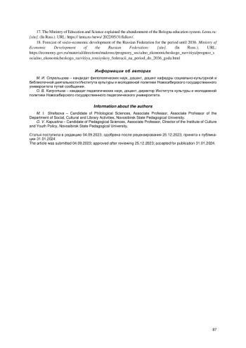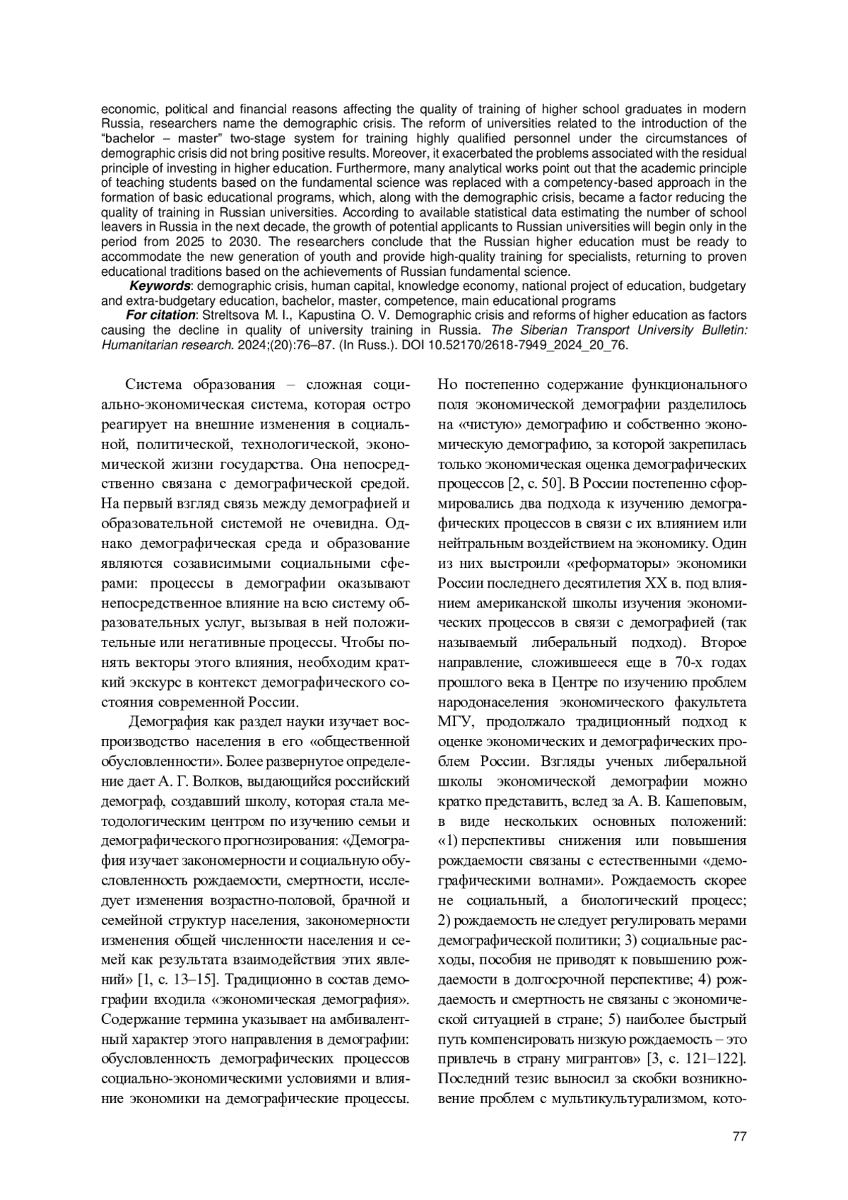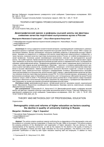 СТРЕЛЬЦОВА М. И., КАПУСТИНА О. В. ДЕМОГРАФИЧЕСКИЙ КРИЗИС И РЕФОРМЫ ВЫСШЕЙ ШКОЛЫ КАК ФАКТОРЫ СНИЖЕНИЯ КАЧЕСТВА ПОДГОТОВКИ ВЫПУСКНИКОВ ВУЗОВ В РОССИИ // ВЕСТНИК СИБИРСКОГО ГОСУДАРСТВЕННОГО УНИВЕРСИТЕТА ПУТЕЙ СООБЩЕНИЯ: ГУМАНИТАРНЫЕ ИССЛЕДОВАНИЯ. 2024. № 1 (20)